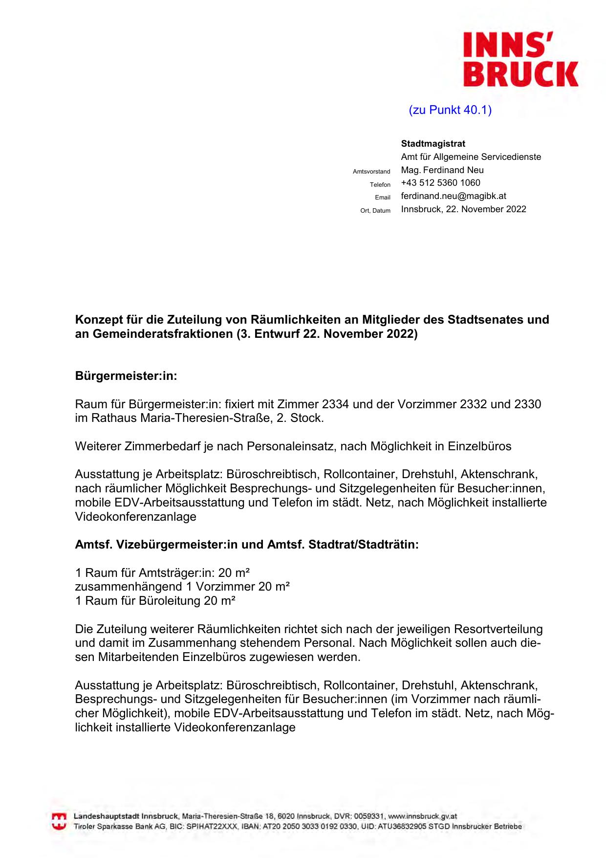 Konzept für die Zuteilung von Räumlichkeiten an Mitglieder des Stadtsenates und