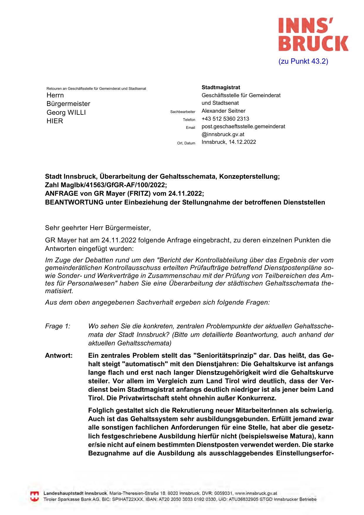 Wo sehen Sie die konkreten, zentralen Problempunkte der aktuellen Gehaltsschemata der Stadt Innsbruck? (Bitte um detaillierte Beantwortung, auch anhand der