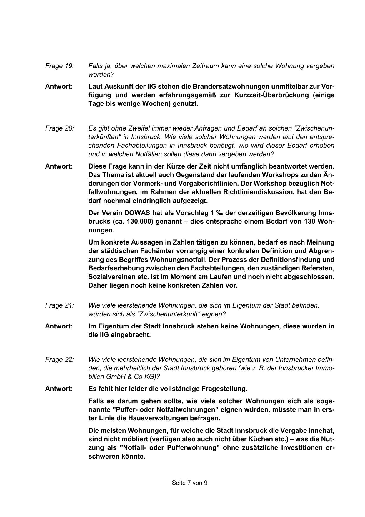 Es gibt ohne Zweifel immer wieder Anfragen und Bedarf an solchen "Zwischenunterkünften" in Innsbruck. Wie viele solcher Wohnungen werden laut den entsprechenden Fachabteilungen in Innsbruck benötigt, wie wird dieser Bedarf erhoben