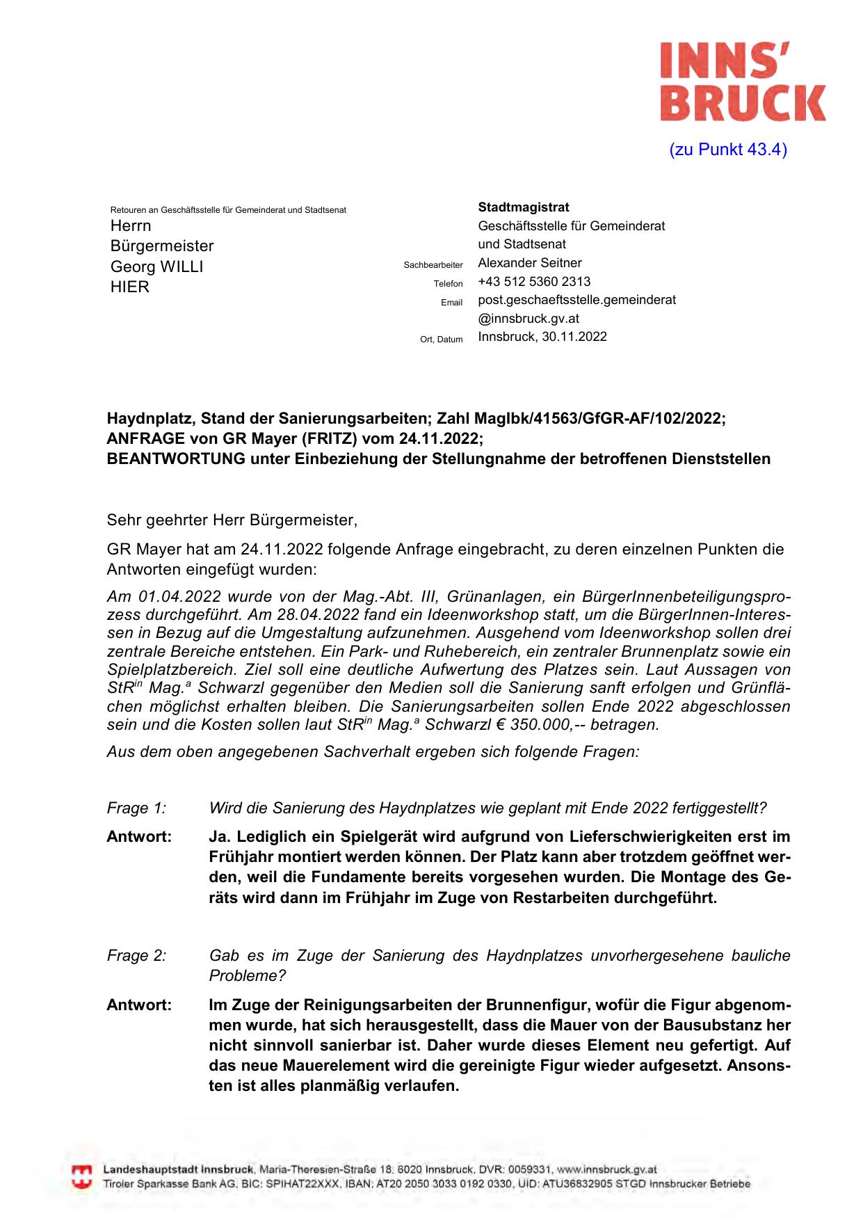 GR Mayer hat am 24.11.2022 folgende Anfrage eingebracht, zu deren einzelnen Punkten die