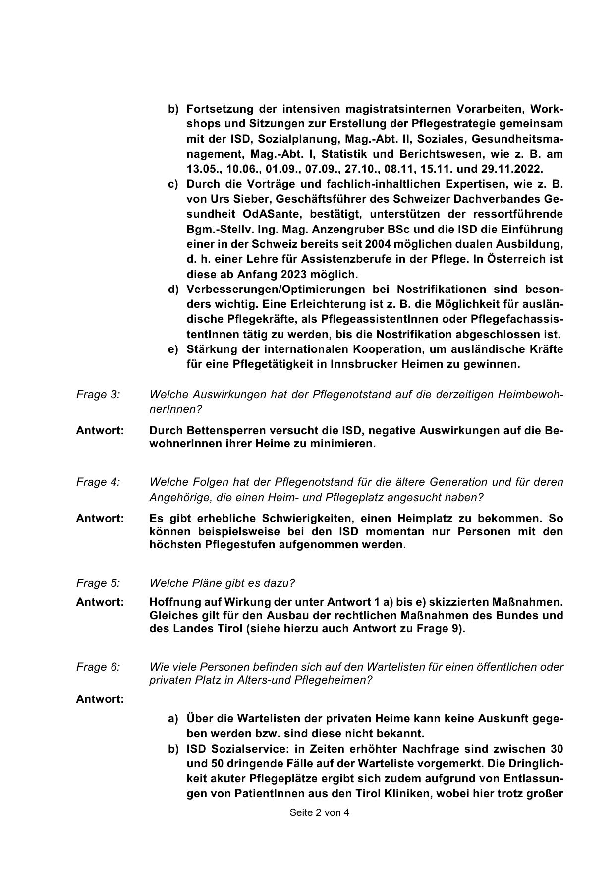 und 50 dringende Fälle auf der Warteliste vorgemerkt. Die Dringlichkeit akuter Pflegeplätze ergibt sich zudem aufgrund von Entlassungen von PatientInnen aus den Tirol Kliniken, wobei hier trotz großer