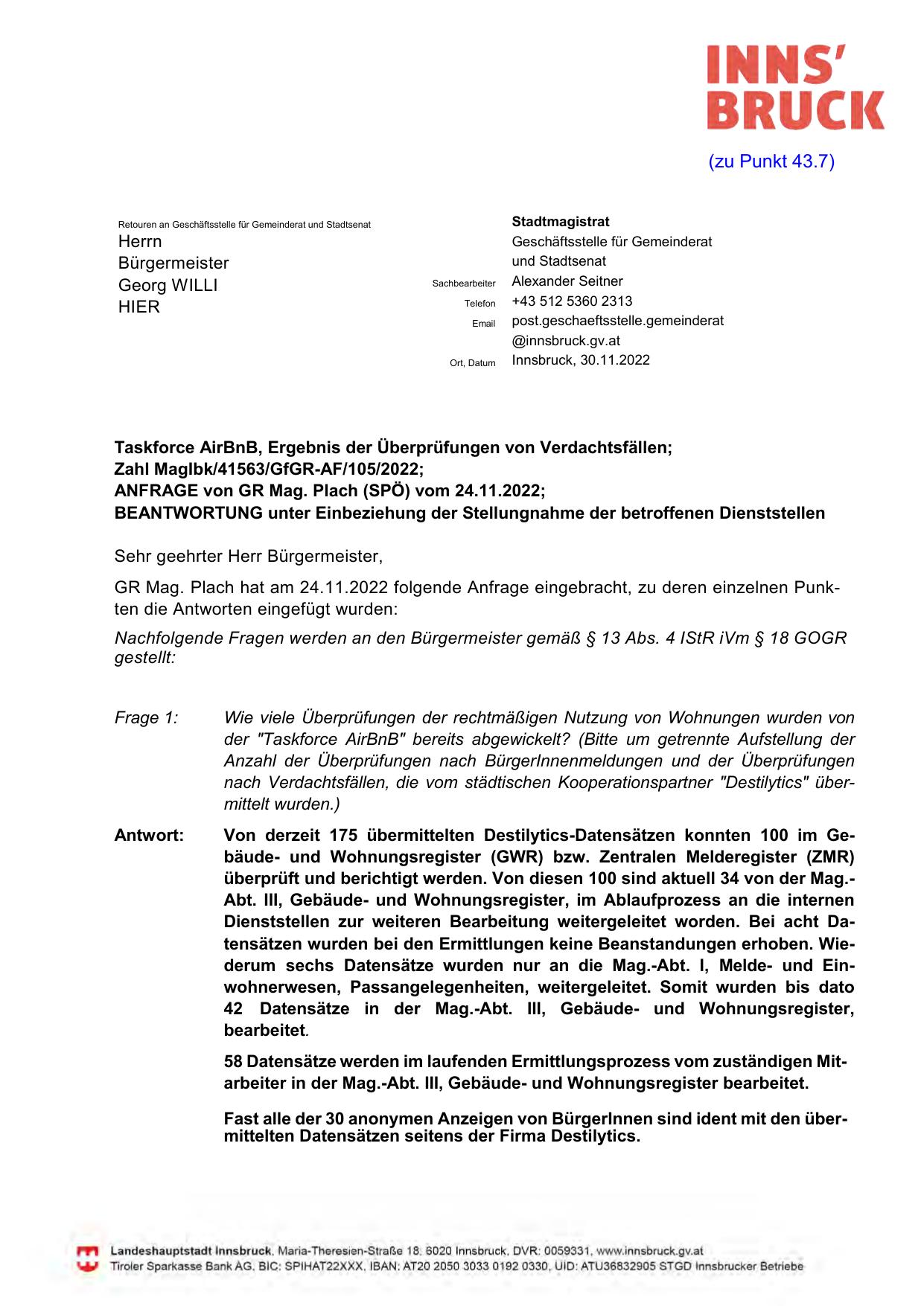 GR Mag. Plach hat am 24.11.2022 folgende Anfrage eingebracht, zu deren einzelnen Punkten die Antworten eingefügt wurden: