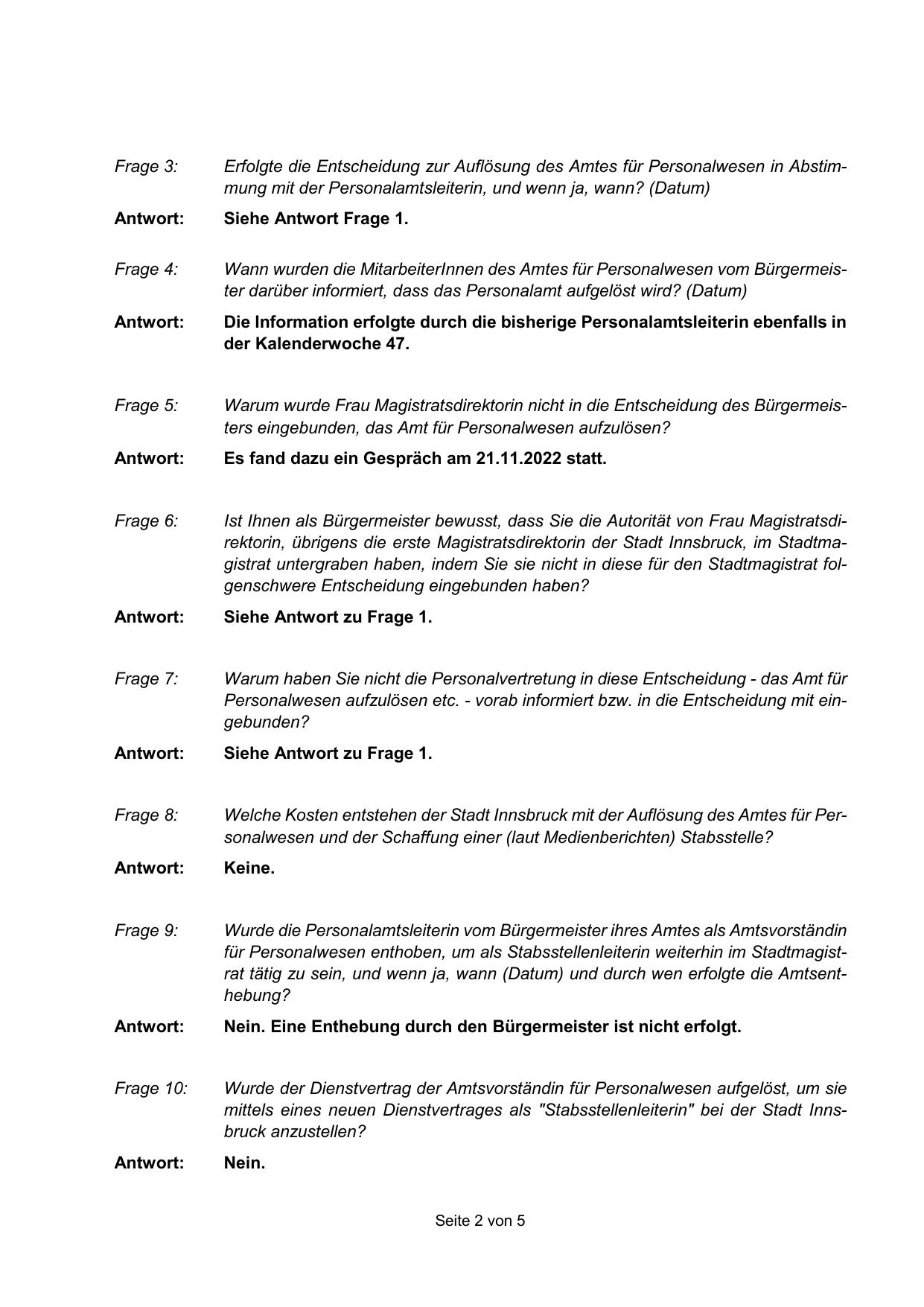 Ist Ihnen als Bürgermeister bewusst, dass Sie die Autorität von Frau Magistratsdirektorin, übrigens die erste Magistratsdirektorin der Stadt Innsbruck, im Stadtmagistrat untergraben haben, indem Sie sie nicht in diese für den Stadtmagistrat folgenschwere Entscheidung eingebunden haben?