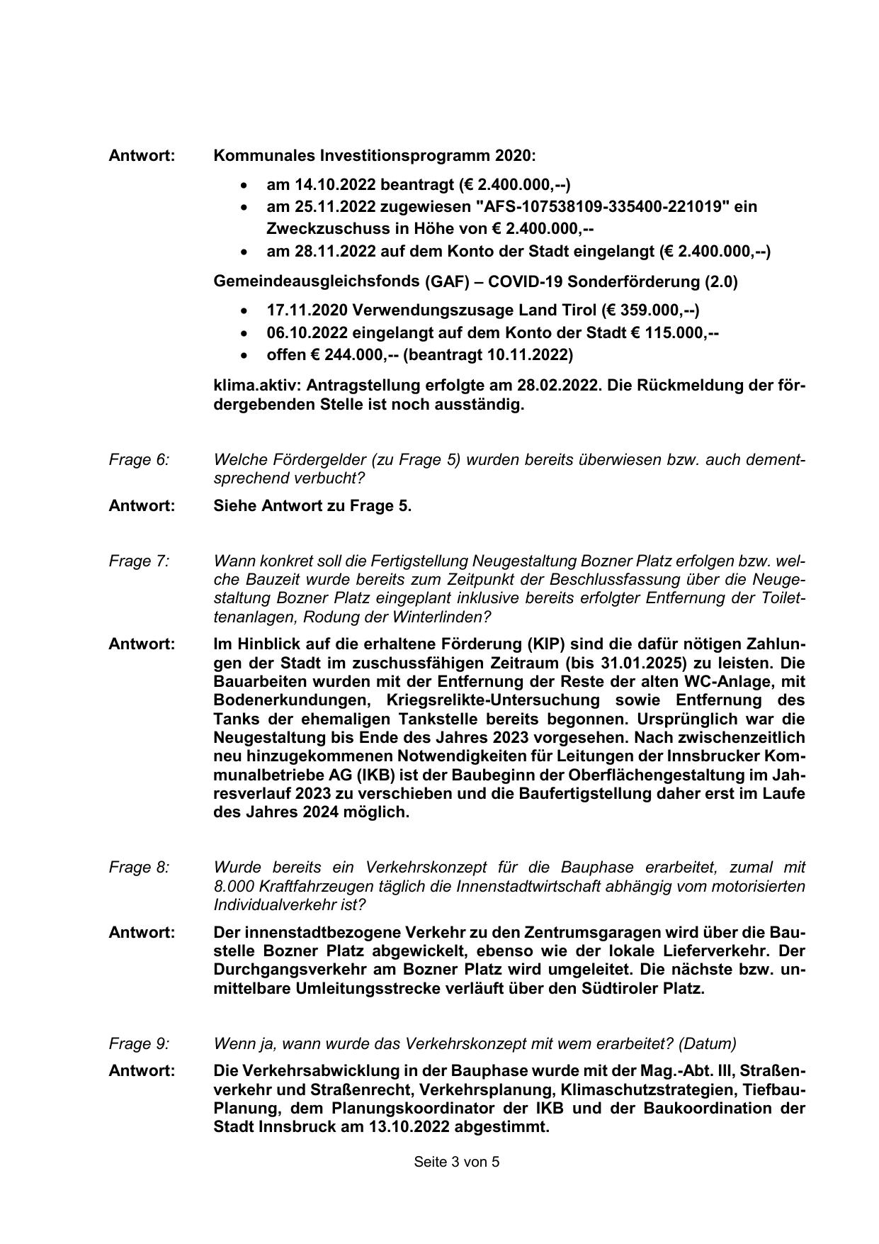 neu hinzugekommenen Notwendigkeiten für Leitungen der Innsbrucker Kommunalbetriebe AG (IKB) ist der Baubeginn der Oberflächengestaltung im Jahresverlauf 2023 zu verschieben und die Baufertigstellung daher erst im Laufe