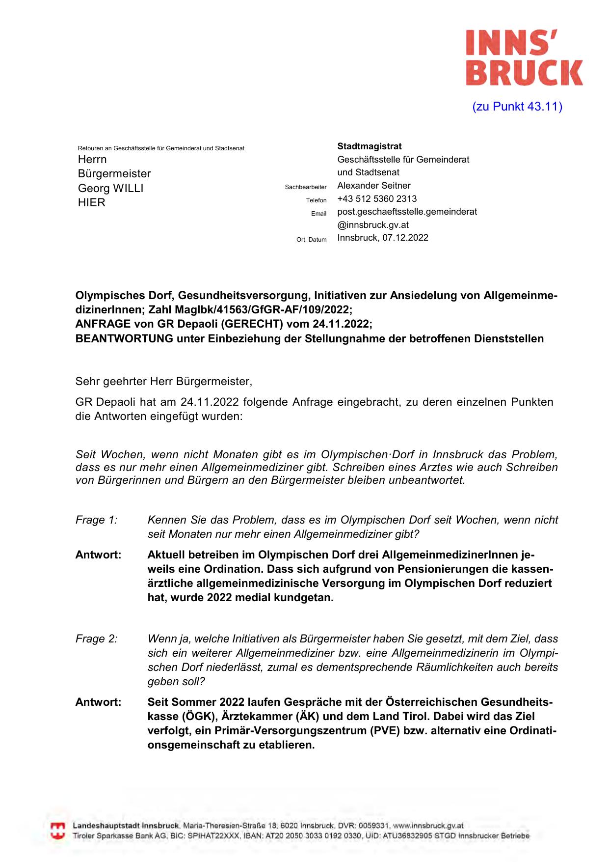 GR Depaoli hat am 24.11.2022 folgende Anfrage eingebracht, zu deren einzelnen Punkten