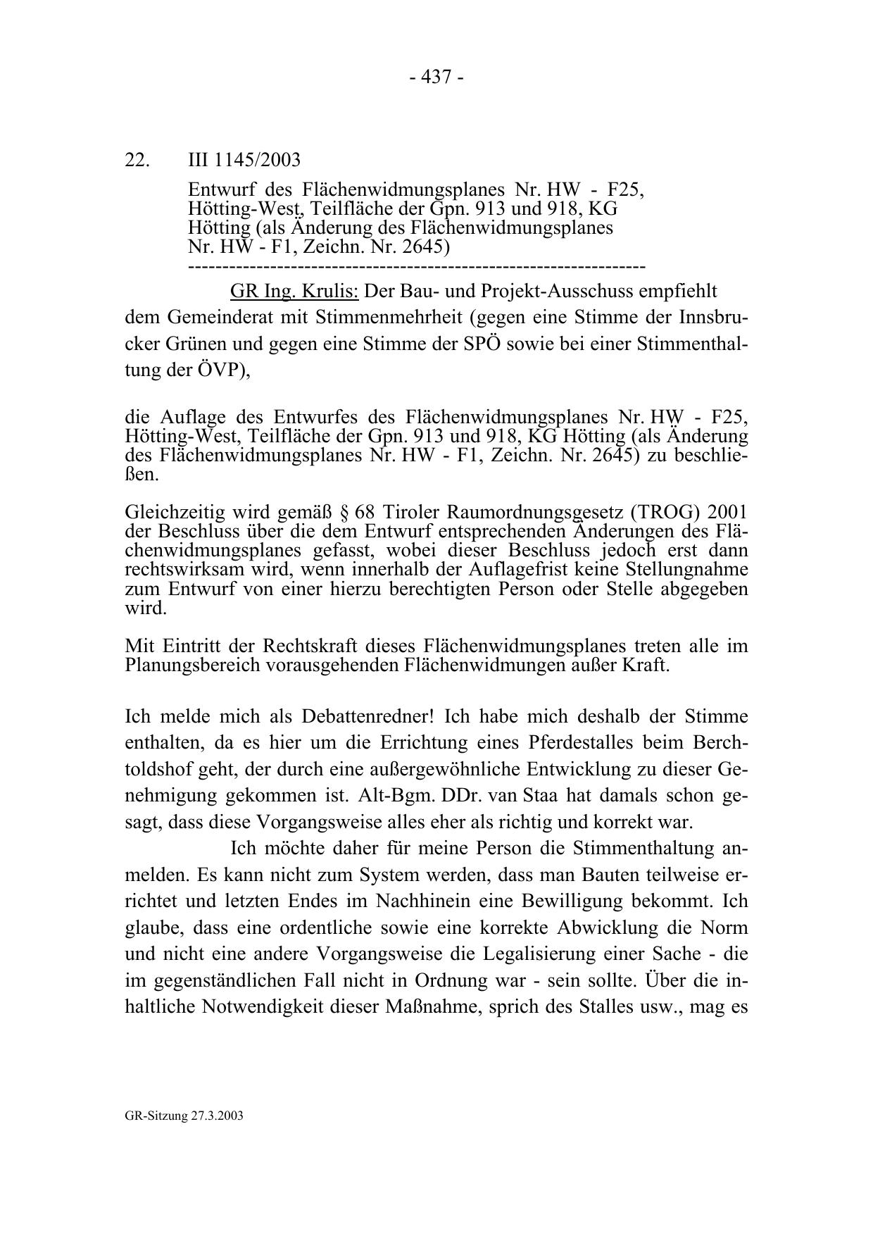 enthalten, da es hier um die Errichtung eines Pferdestalles beim Berchtoldshof geht, der durch eine außergewöhnliche Entwicklung zu dieser Genehmigung gekommen ist. Alt-Bgm. DDr. van Staa hat damals schon gesagt, dass diese Vorgangsweise alles eher als richtig und korrekt war.