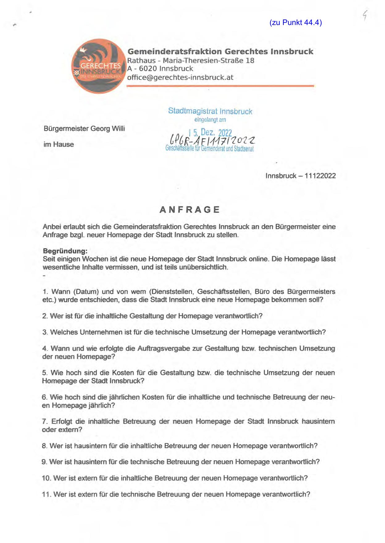 Anbei erlaubt sich die Gemeinderatsfraktion Gerechtes Innsbruck an den Bürgermeister eine