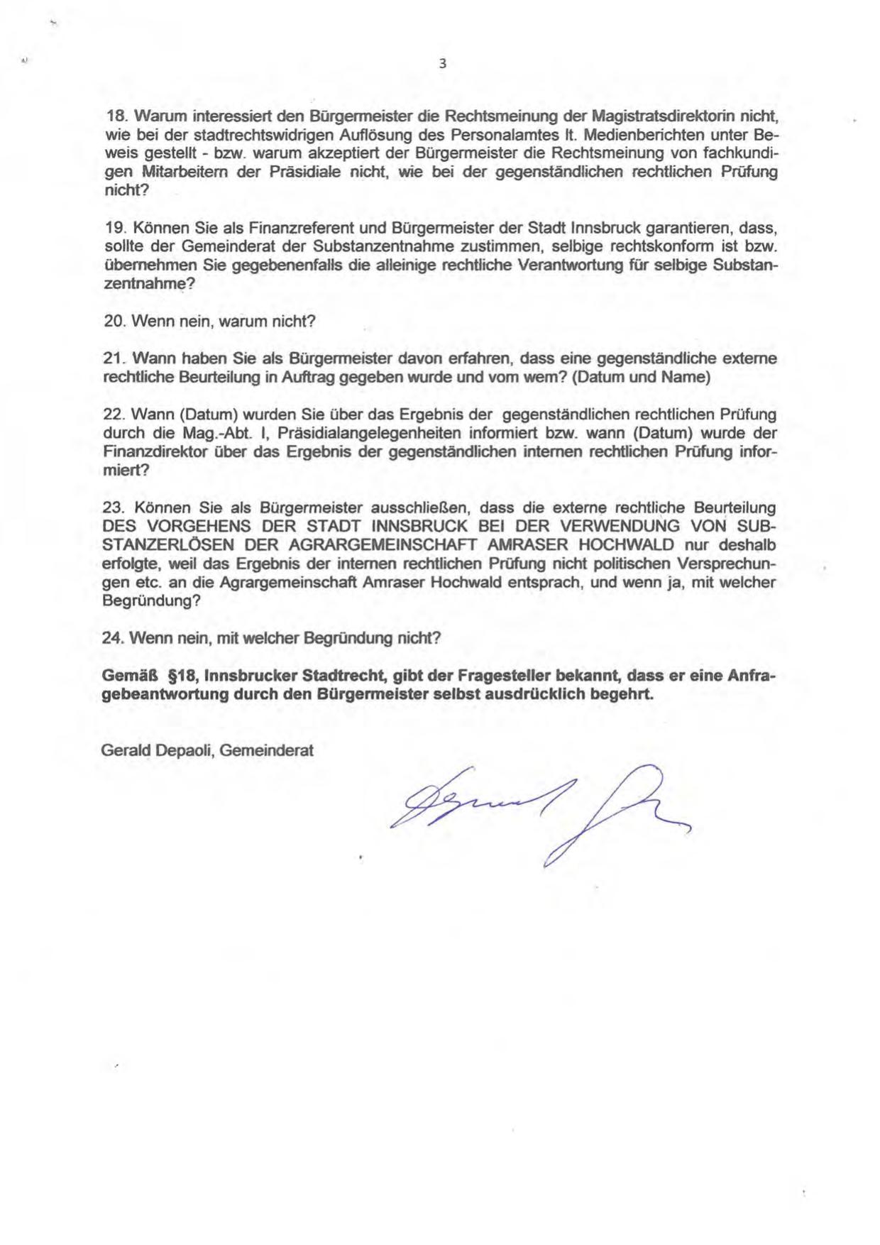Gemäß §18, lnnsbrucker Stadtrecht, gibt der Fragesteller bekannt, dass er eine Anfragebeantwortung durch den Bürgermeister selbst ausdrücklich begehrt.