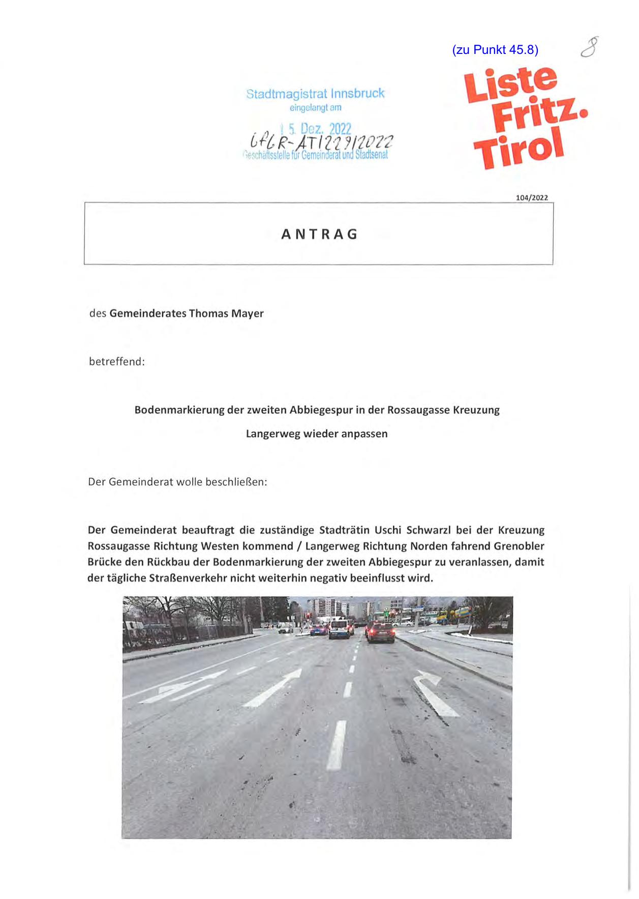 Der Gemeinderat beauftragt die zuständige Stadträtin Uschi Schwarz! bei der Kreuzung