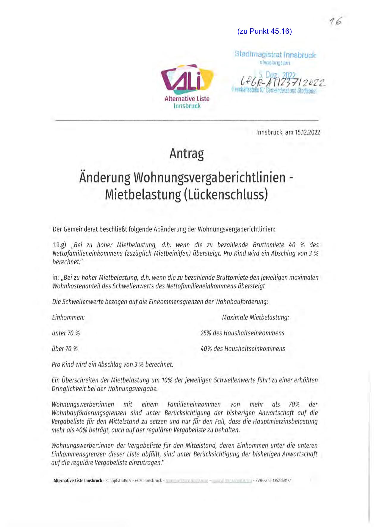 Änderung Wohnungsvergaberichtlinien Mietbelastung (Lückenschluss)