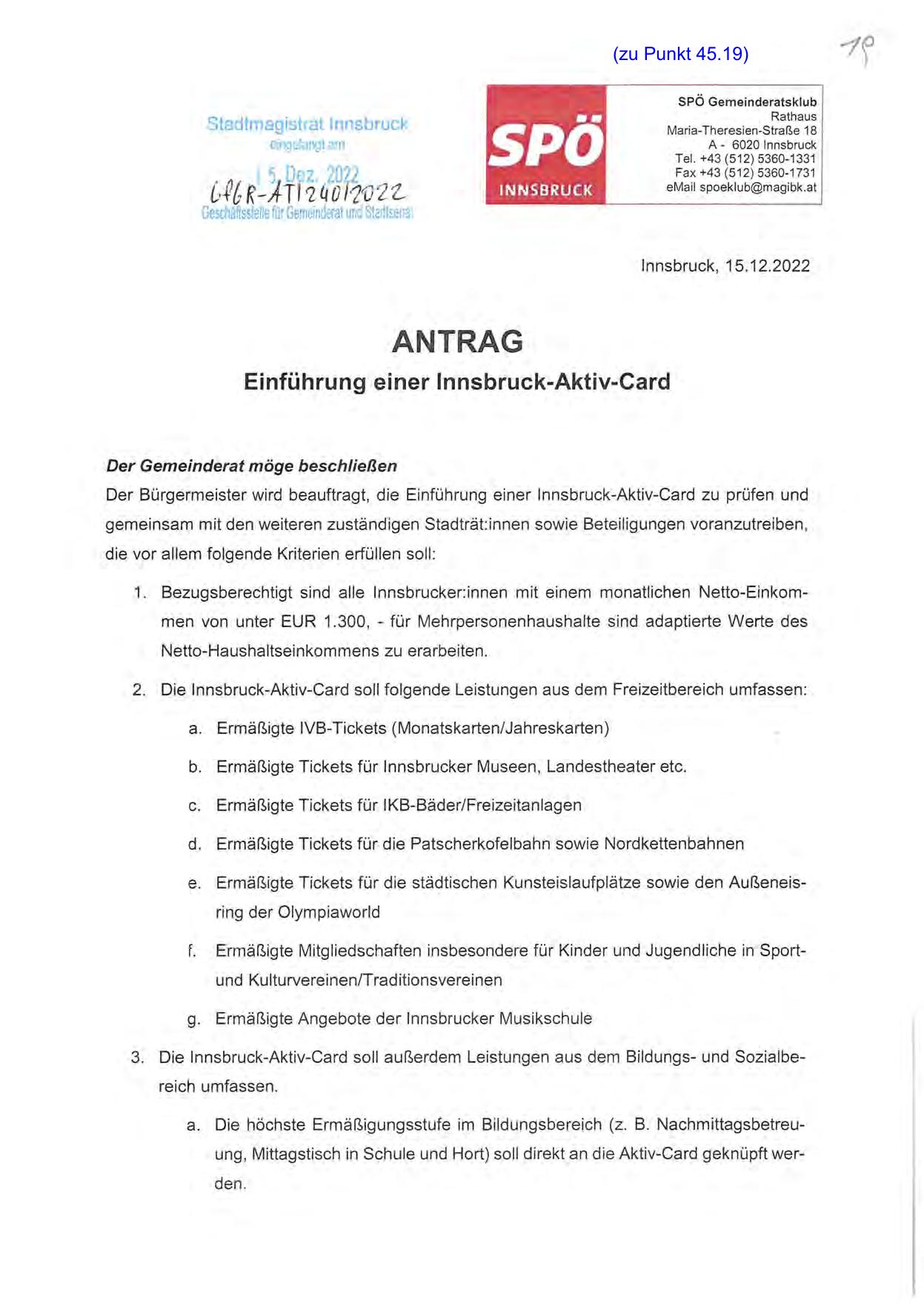 Der Bürgermeister wird beauftragt, die Einführung einer lnnsbruck-Aktiv-Card zu prüfen und