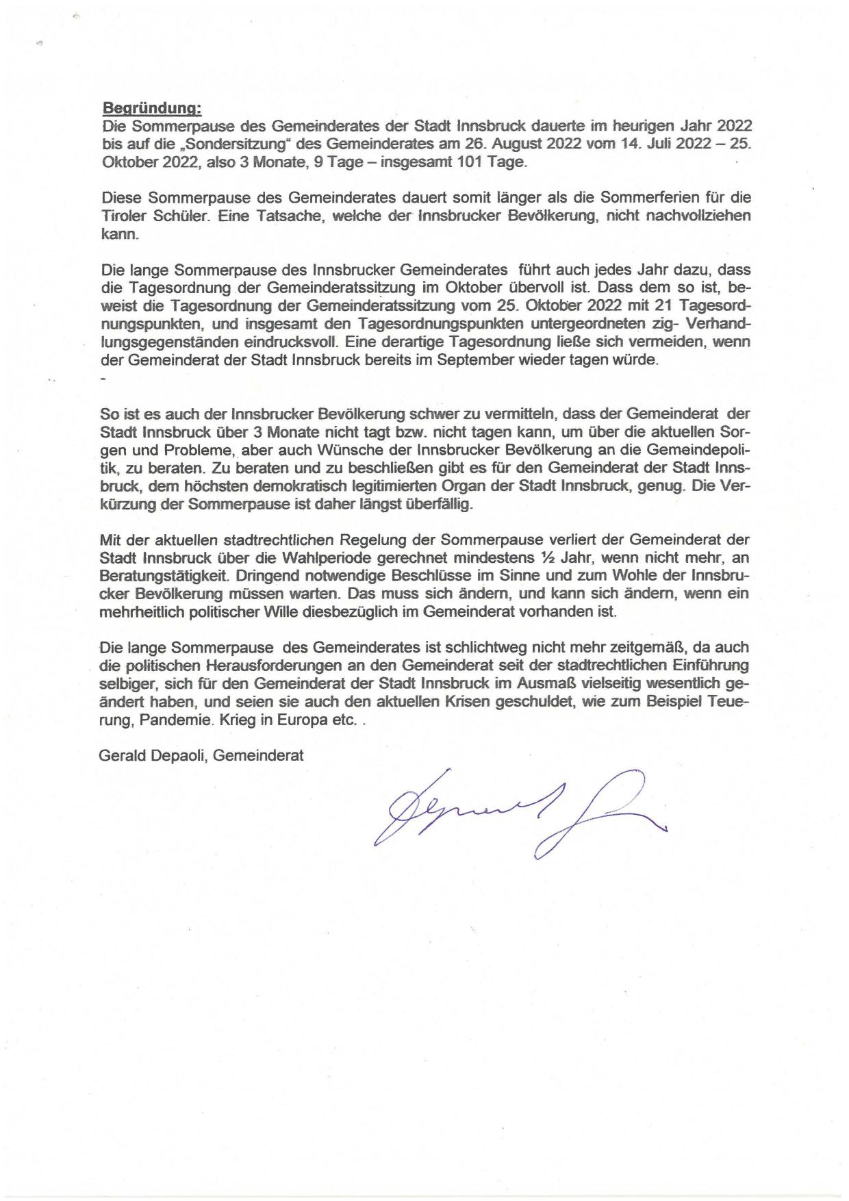 Stadt Innsbruck über 3 Monate nicht tagt bzw. nicht tagen kann, um über die aktuellen Sorgen und Probleme, . aber auch Wünsche der lnnsbrucker Bevölkerung an die Gemeindepolitik, zu beraten. Zu beraten und zu beschließen gibt es für den Gemeinderat der Stadt Innsbruck, dem höchsten demokratisch legitimierten Organ der Stadt Innsbruck, genug. Die Verkürzung der Sommerpause ist daher längst überfällig.