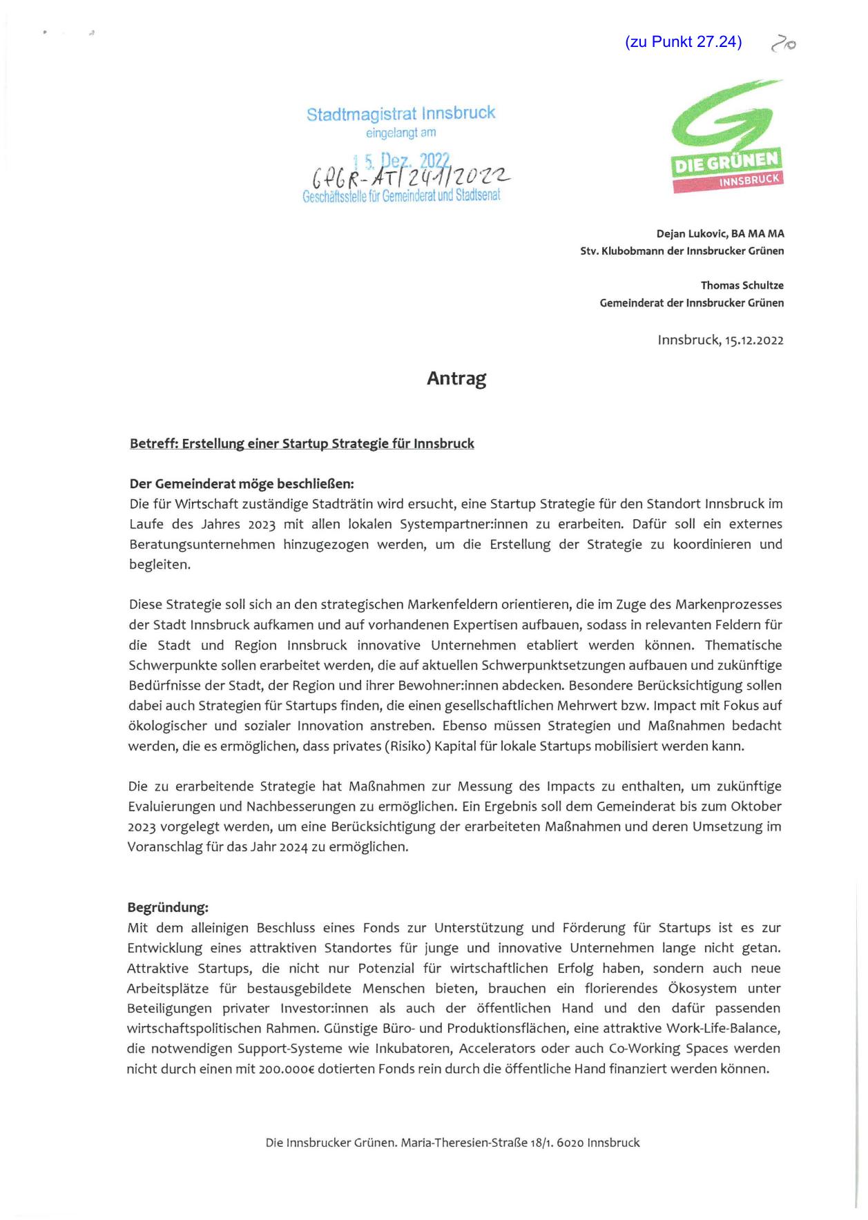 Die für Wirtschaft zuständige Stadträtin wird ersucht, eine Startup Strategie für den Standort Innsbruck im