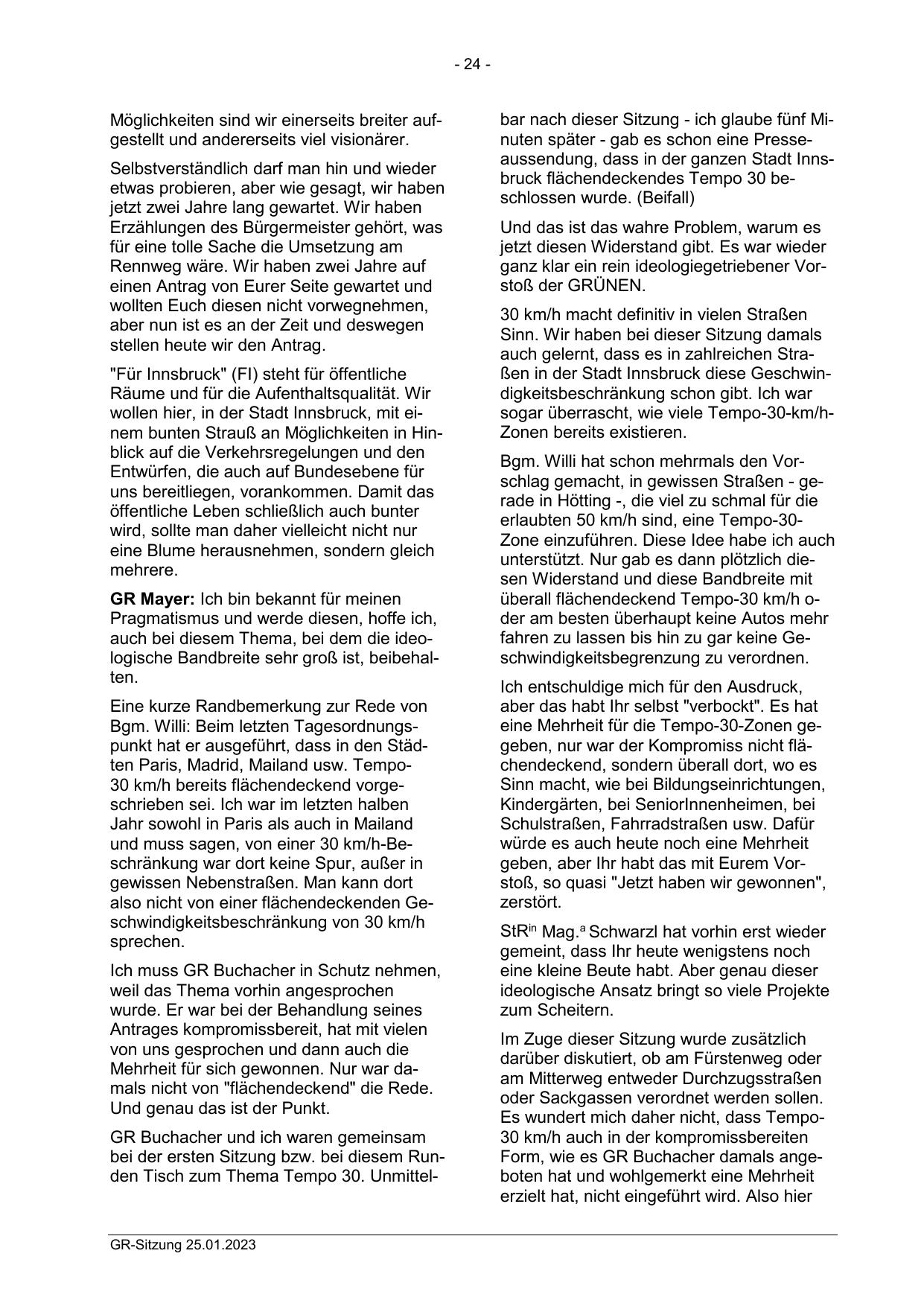 bar nach dieser Sitzung - ich glaube fünf Minuten später - gab es schon eine Presseaussendung, dass in der ganzen Stadt Innsbruck flächendeckendes Tempo 30 beschlossen wurde. (Beifall)