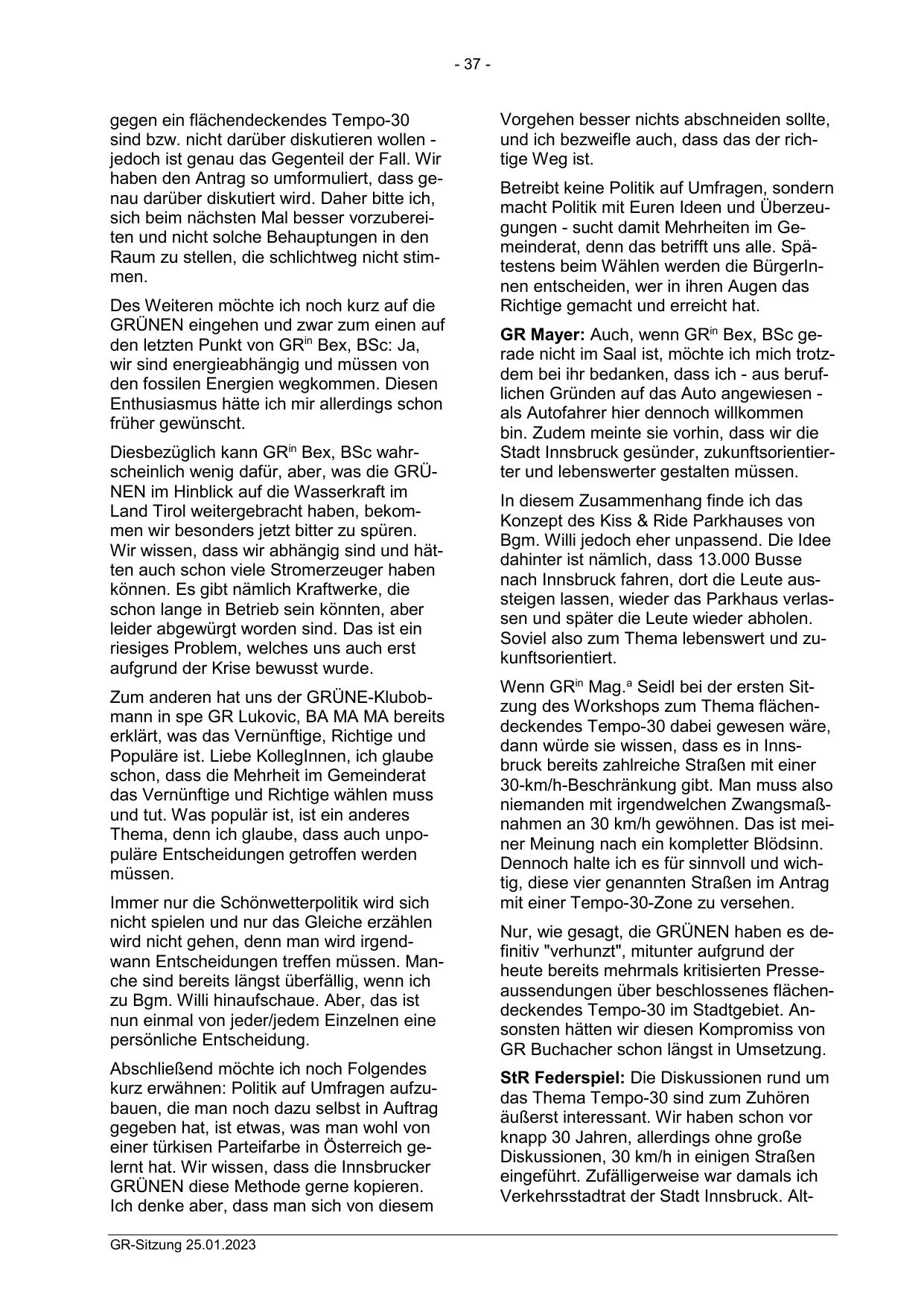 GR Mayer: Auch, wenn GRin Bex, BSc gerade nicht im Saal ist, möchte ich mich trotzdem bei ihr bedanken, dass ich - aus beruflichen Gründen auf das Auto angewiesen als Autofahrer hier dennoch willkommen