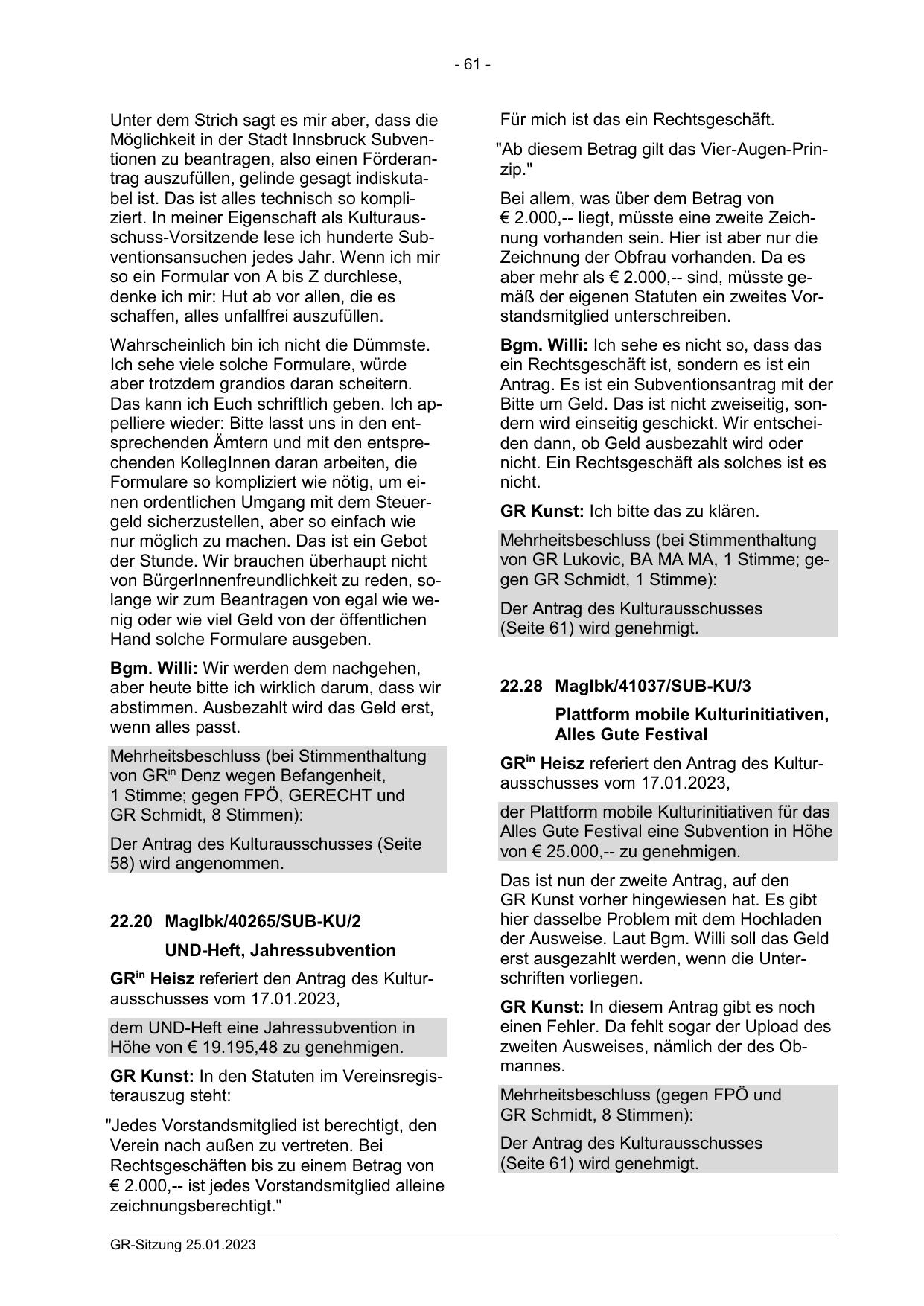 Möglichkeit in der Stadt Innsbruck Subventionen zu beantragen, also einen Förderantrag auszufüllen, gelinde gesagt indiskutabel ist. Das ist alles technisch so kompliziert. In meiner Eigenschaft als Kulturausschuss-Vorsitzende lese ich hunderte Subventionsansuchen jedes Jahr. Wenn ich mir