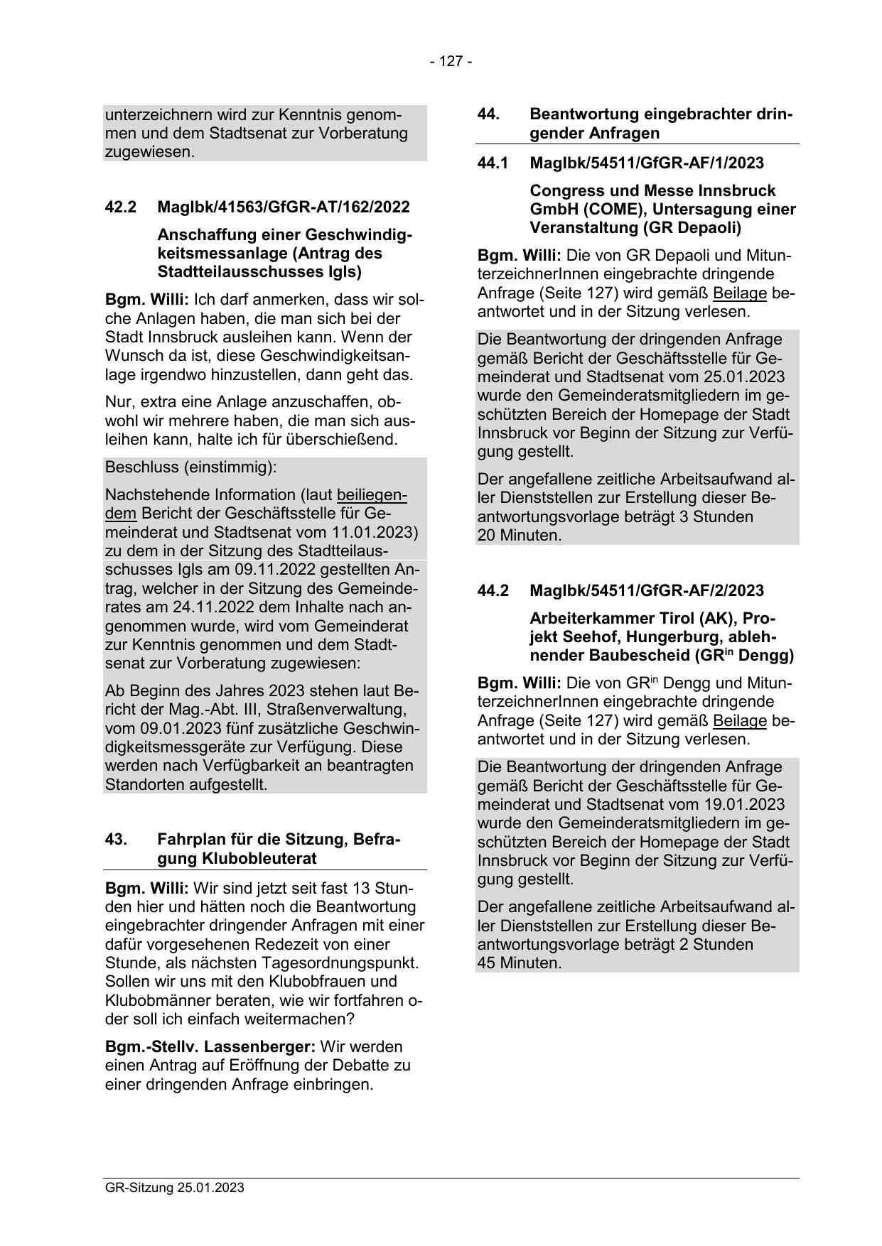 Bgm. Willi: Wir sind jetzt seit fast 13 Stunden hier und hätten noch die Beantwortung