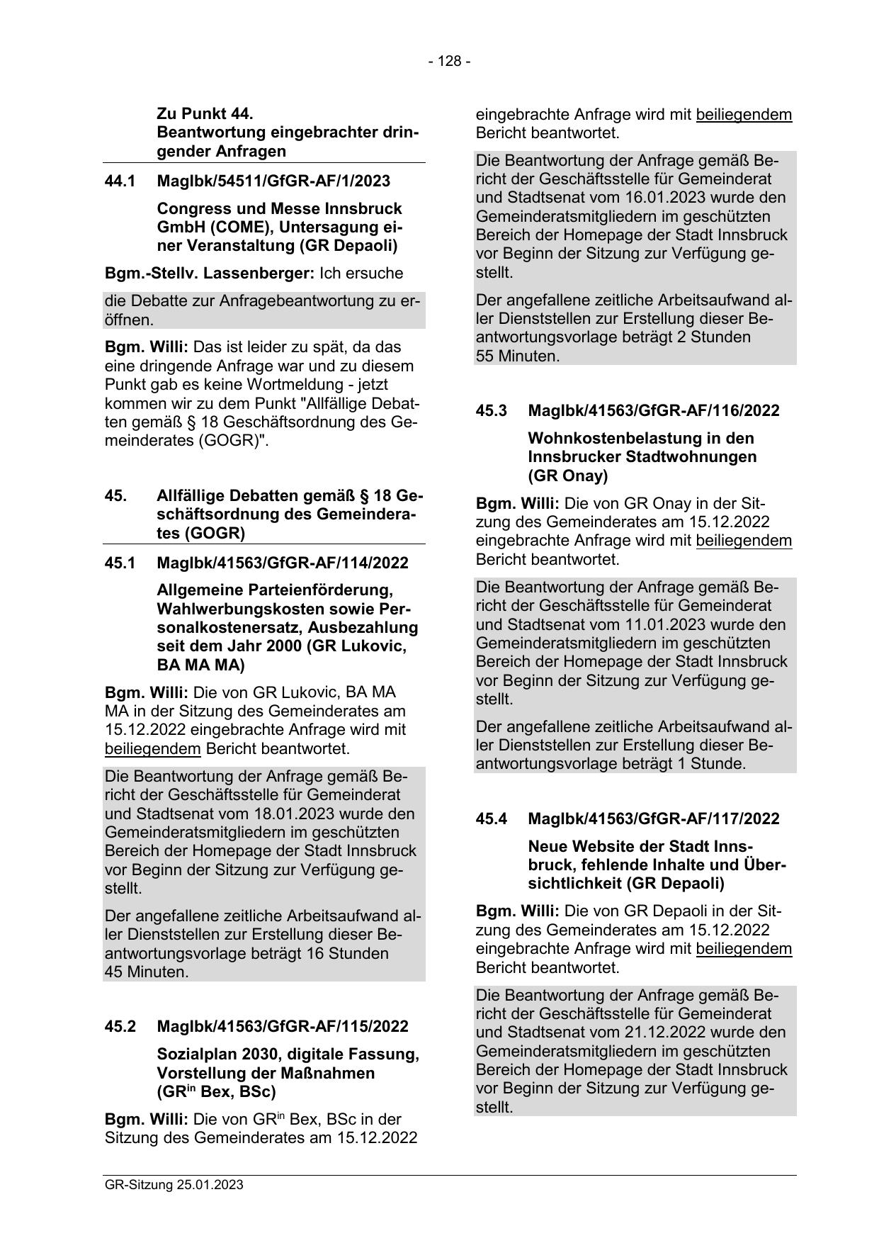 Bgm. Willi: Die von GR Depaoli in der Sitzung des Gemeinderates am 15.12.2022