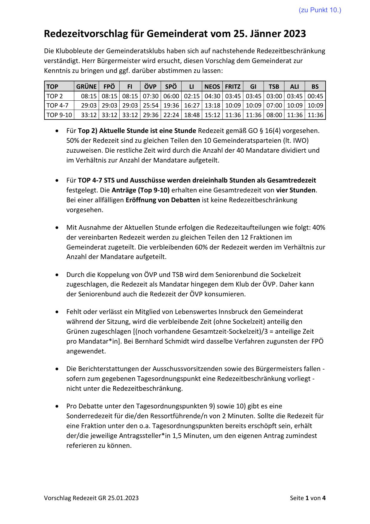 Redezeitvorschlag für Gemeinderat vom 25. Jänner 2023