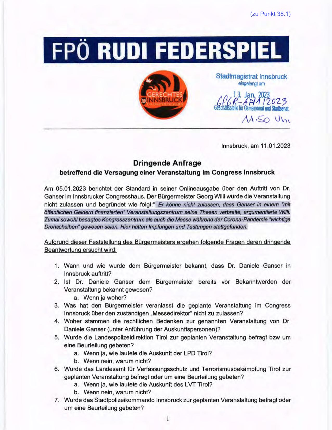 Ganser im lnnsbrucker Congresshaus. Der Bürgermeister Georg Willi würde die Veranstaltung