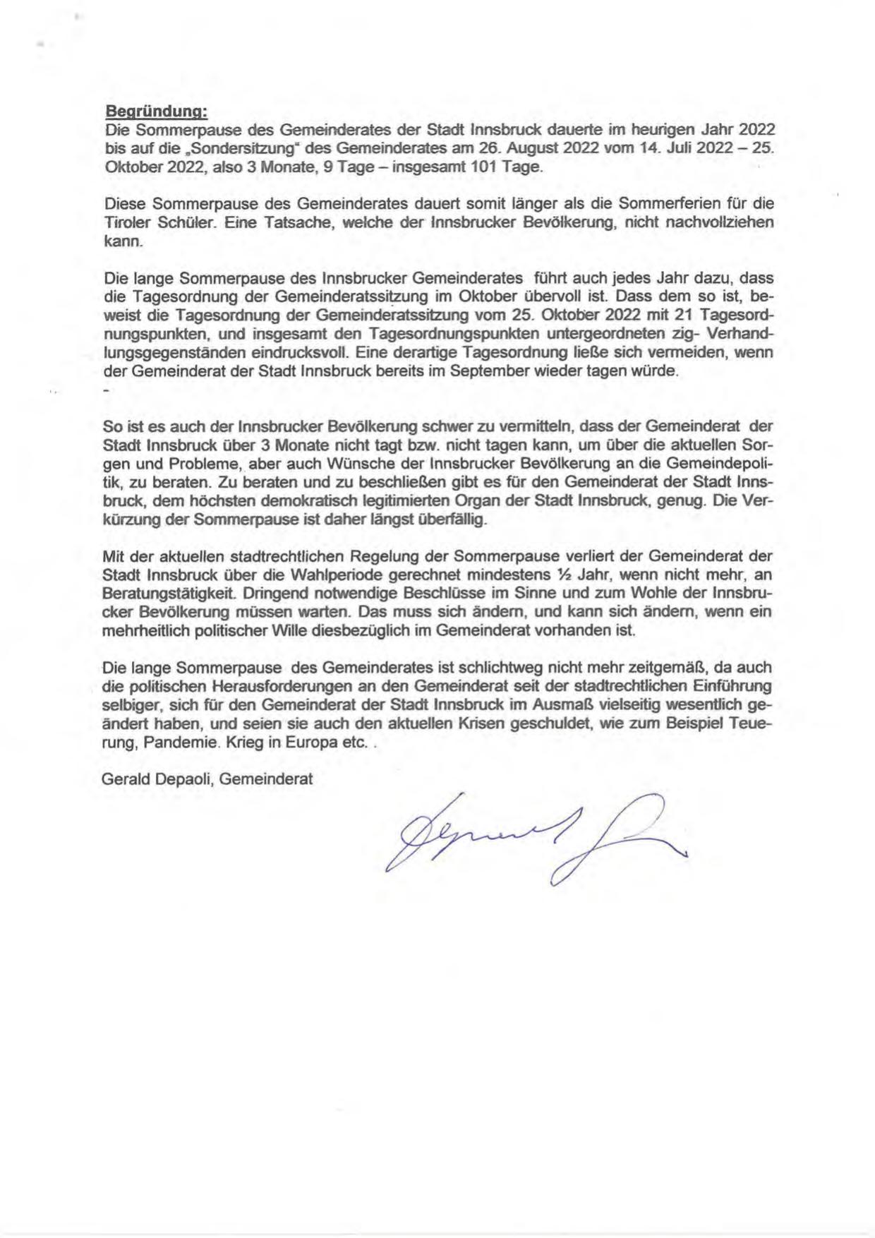 Stadt Innsbruck über 3 Monate nicht tagt bzw. nicht tagen kann, um über die aktuellen Sorgen und Probleme, .aber auch Wünsche der lnnsbrucker Bevölkerung an die Gemeindepolitik, zu beraten. Zu beraten und zu beschließen gibt es für den Gemeinderat der Stadt Innsbruck, dem höchsten demokratisch legitimierten Organ der Stadt Innsbruck, genug. Die Verkürzung der Sommerpause ist daher längst überfällig.