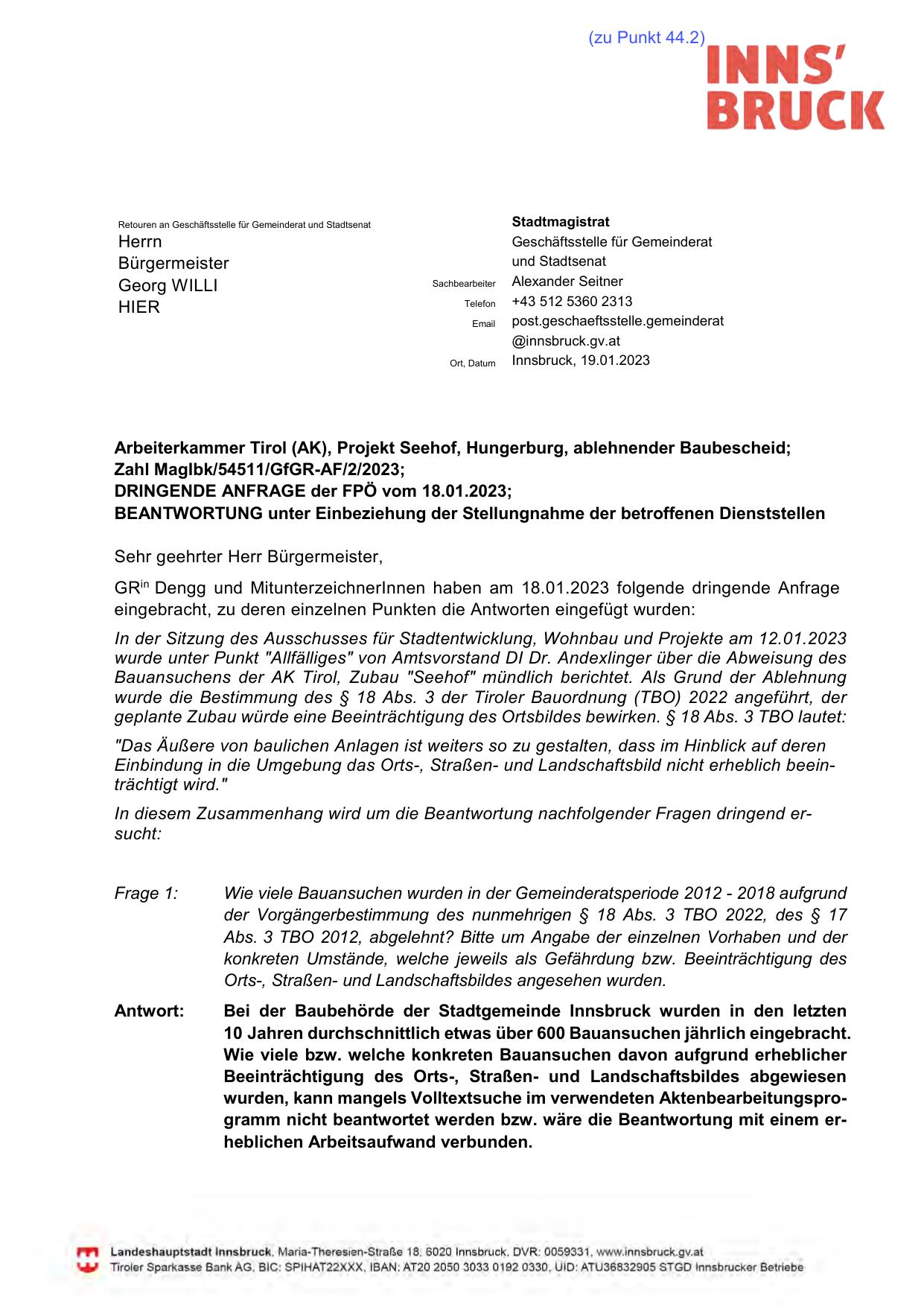 Bauansuchens der AK Tirol, Zubau "Seehof" mündlich berichtet. Als Grund der Ablehnung