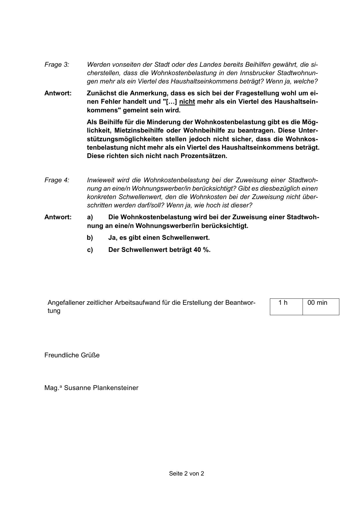 Werden vonseiten der Stadt oder des Landes bereits Beihilfen gewährt, die sicherstellen, dass die Wohnkostenbelastung in den Innsbrucker Stadtwohnungen mehr als ein Viertel des Haushaltseinkommens beträgt? Wenn ja, welche?