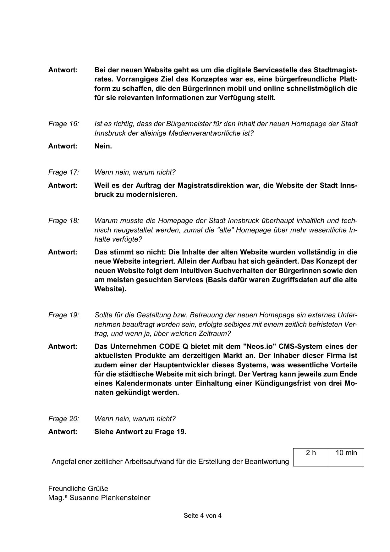 Angefallener zeitlicher Arbeitsaufwand für die Erstellung der Beantwortung