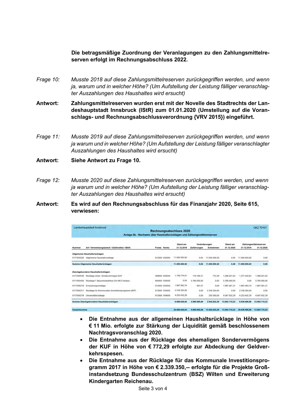 Zahlungsmittelreserven wurden erst mit der Novelle des Stadtrechts der Landeshauptstadt Innsbruck (IStR) zum 01.01.2020 (Umstellung auf die Voranschlags- und Rechnungsabschlussverordnung {VRV 2015}) eingeführt.