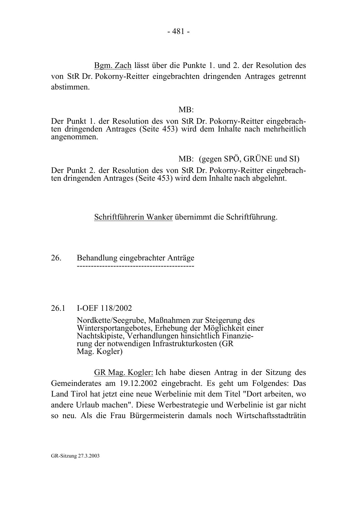 Der Punkt 2. der Resolution des von StR Dr. Pokorny-Reitter eingebrachten dringenden Antrages (Seite 453) wird dem Inhalte nach abgelehnt.
