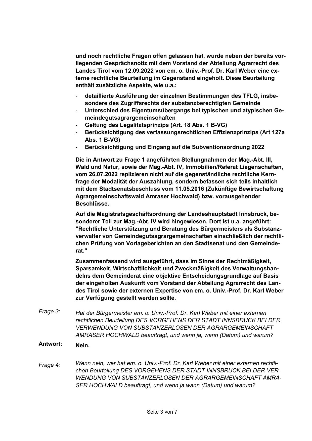 Wenn nein, wer hat em. o. Univ.-Prof. Dr. Karl Weber mit einer externen rechtlichen Beurteilung DES VORGEHENS DER STADT INNSBRUCK BEI DER VERWENDUNG VON SUBSTANZERLOSEN DER AGRARGEMEINSCHAFT AMRASER HOCHWALD beauftragt, und wenn ja wann (Datum) und warum?