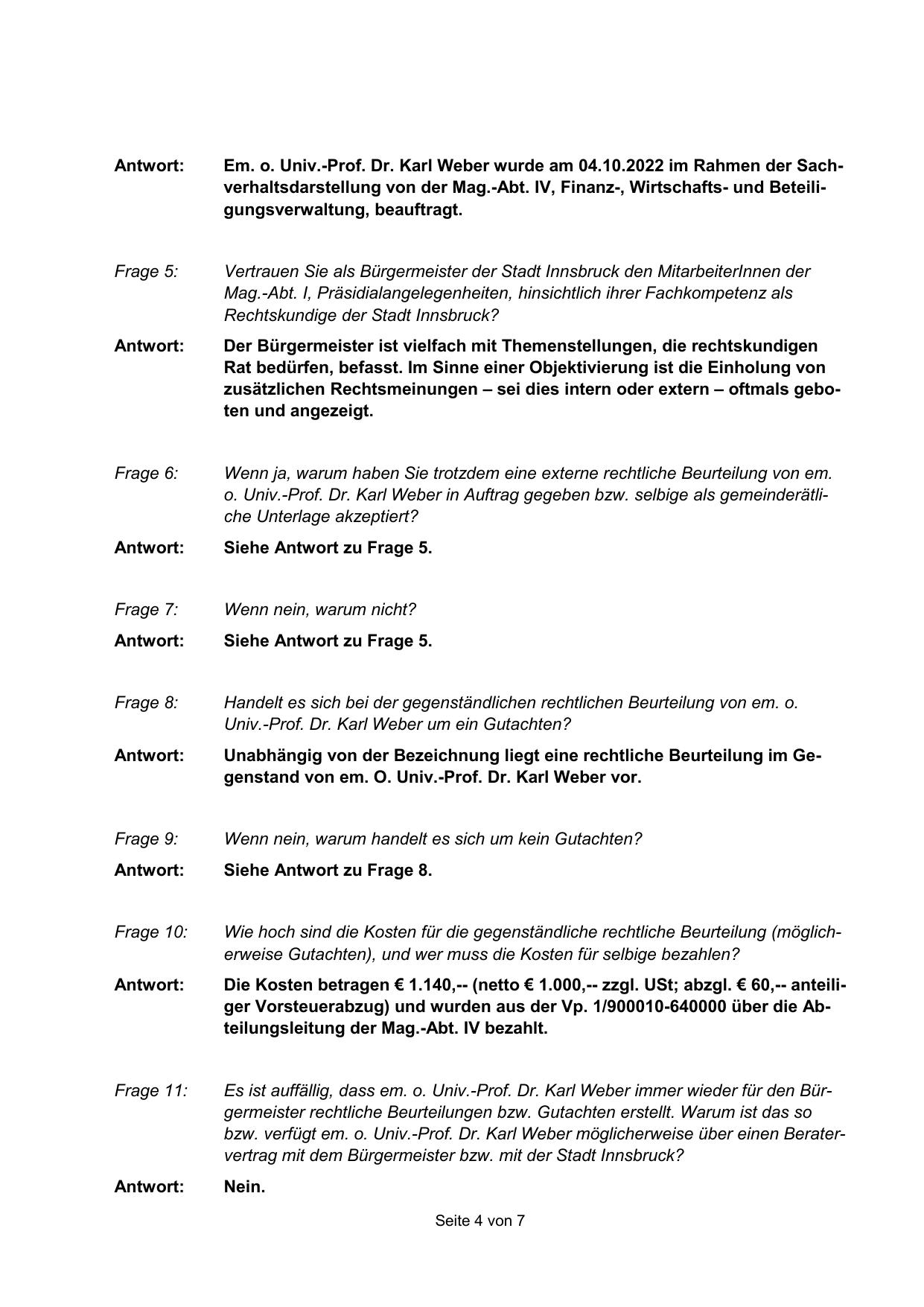 bzw. verfügt em. o. Univ.-Prof. Dr. Karl Weber möglicherweise über einen Beratervertrag mit dem Bürgermeister bzw. mit der Stadt Innsbruck?