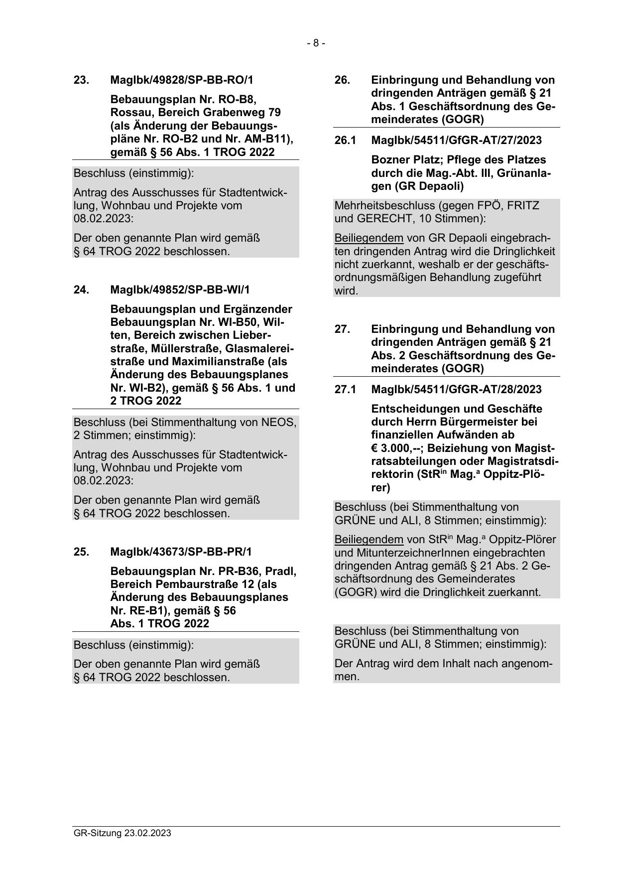 GRÜNE und ALI, 8 Stimmen; einstimmig):