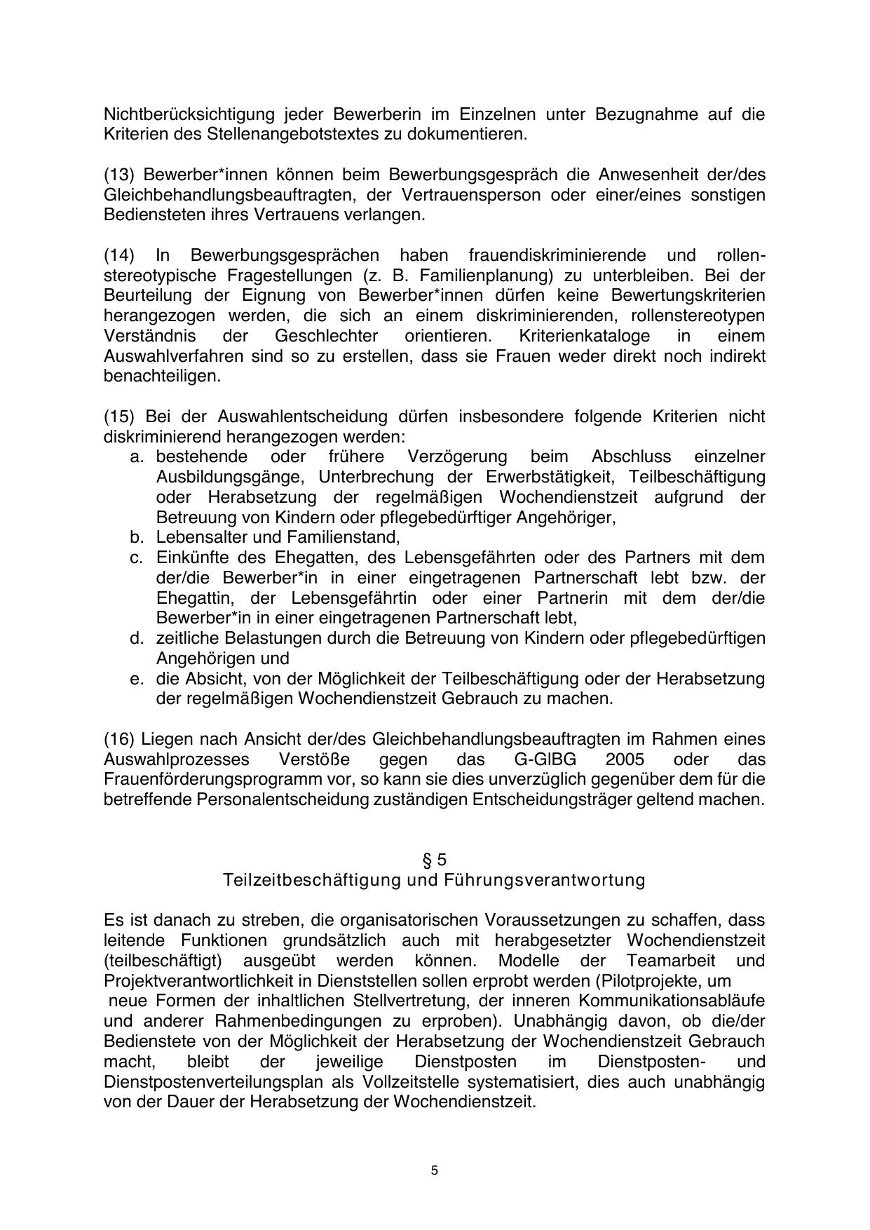 (14) In Bewerbungsgesprächen haben frauendiskriminierende und rollenstereotypische Fragestellungen (z. B. Familienplanung) zu unterbleiben. Bei der