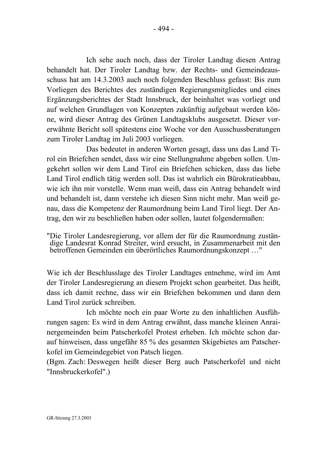 Ich möchte noch ein paar Worte zu den inhaltlichen Ausführungen sagen: Es wird in dem Antrag erwähnt, dass manche kleinen Anrainergemeinden beim Patscherkofel Protest erheben. Ich möchte schon darauf hinweisen, dass ungefähr 85 % des gesamten Skigebietes am Patscherkofel im Gemeindegebiet von Patsch liegen.
