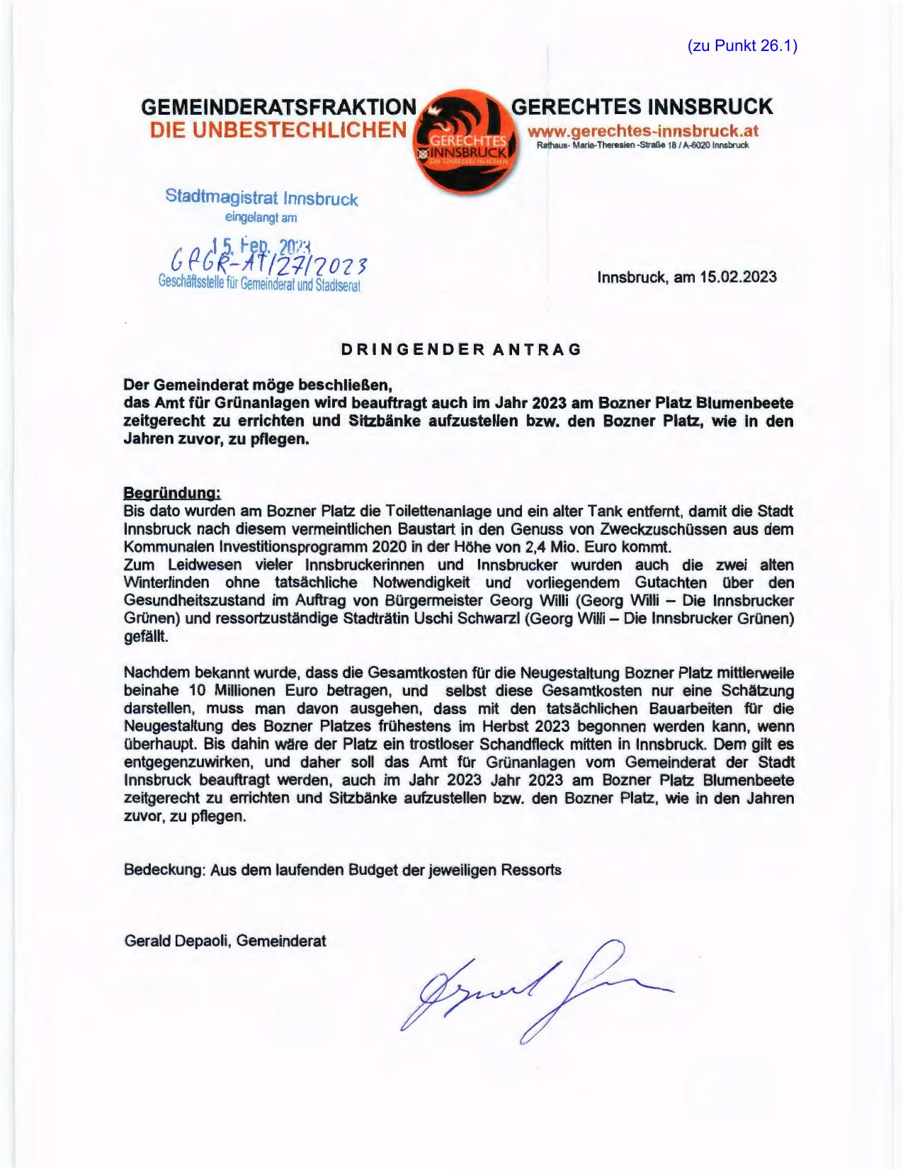 zeitgerecht zu errichten und Sitzbänke aufzustellen bzw. den Bozner Platz, wie in den