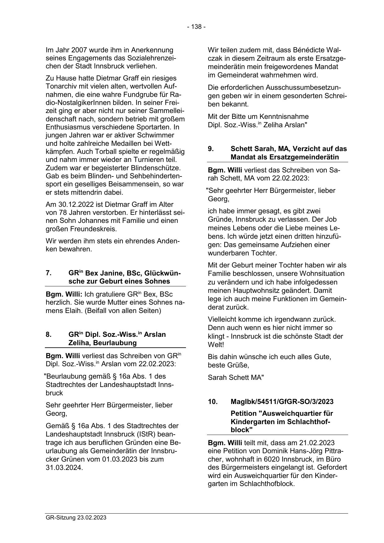 Landeshauptstadt Innsbruck (IStR) beantrage ich aus beruflichen Gründen eine Beurlaubung als Gemeinderätin der Innsbrucker Grünen vom 01.03.2023 bis zum