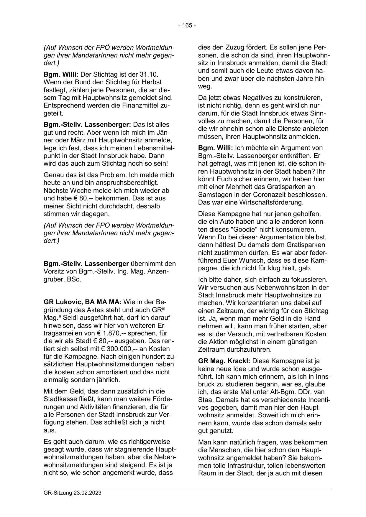 (Auf Wunsch der FPÖ werden Wortmeldungen ihrer MandatarInnen nicht mehr gegendert.)