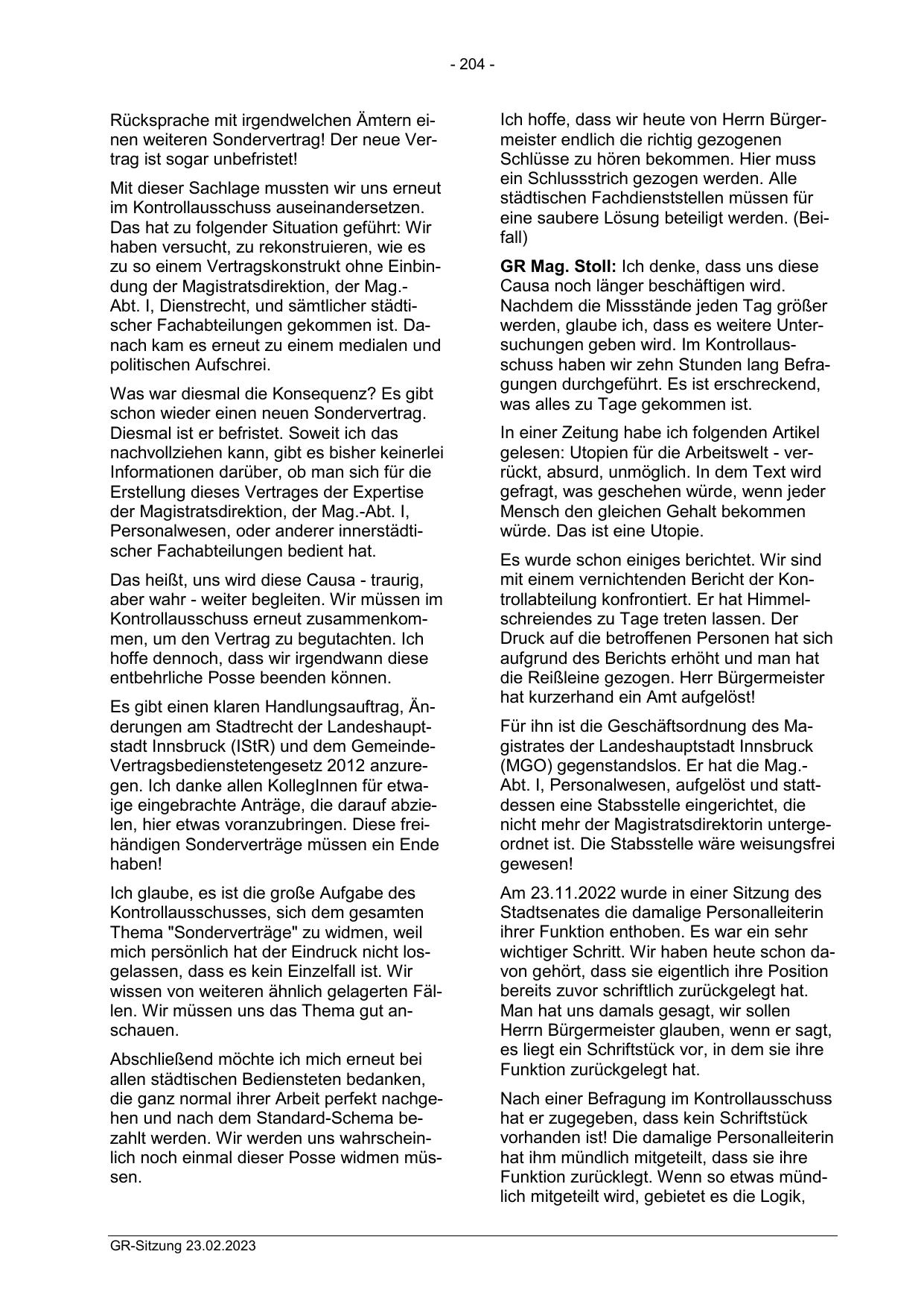 Es gibt einen klaren Handlungsauftrag, Änderungen am Stadtrecht der Landeshauptstadt Innsbruck (IStR) und dem GemeindeVertragsbedienstetengesetz 2012 anzuregen. Ich danke allen KollegInnen für etwaige eingebrachte Anträge, die darauf abzielen, hier etwas voranzubringen. Diese freihändigen Sonderverträge müssen ein Ende