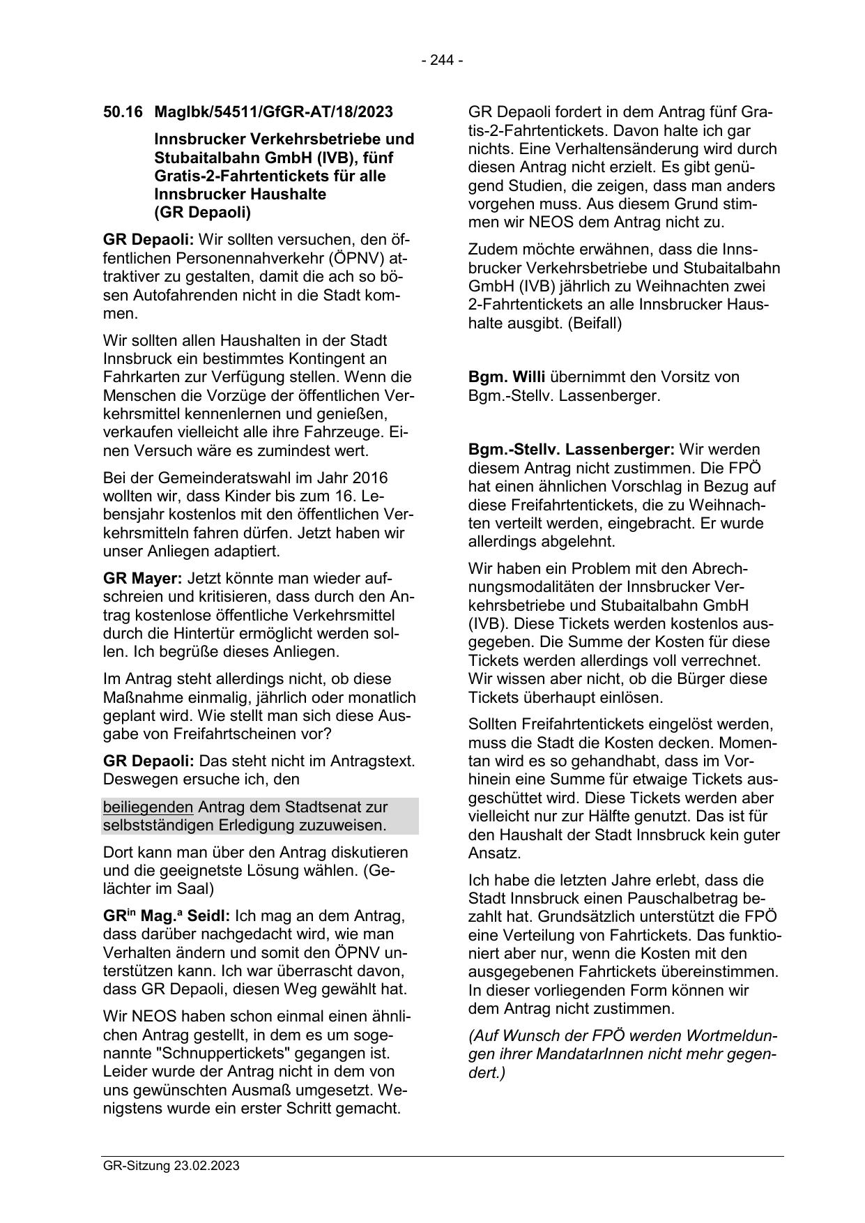 GR Mayer: Jetzt könnte man wieder aufschreien und kritisieren, dass durch den Antrag kostenlose öffentliche Verkehrsmittel
