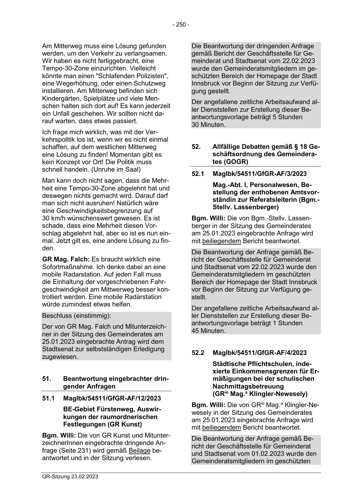 Bgm. Willi: Die von GR Kunst und MitunterzeichnerInnen eingebrachte dringende Anfrage (Seite 231) wird gemäß Beilage beantwortet und in der Sitzung verlesen.