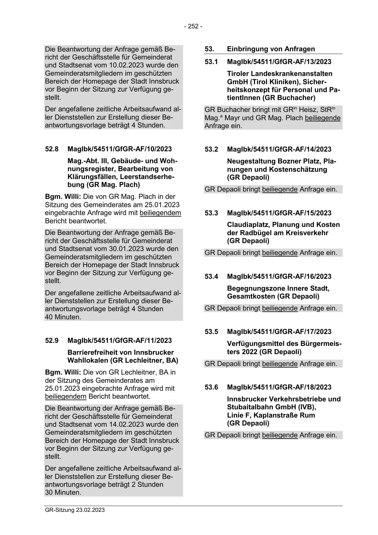 Die Beantwortung der Anfrage gemäß Bericht der Geschäftsstelle für Gemeinderat