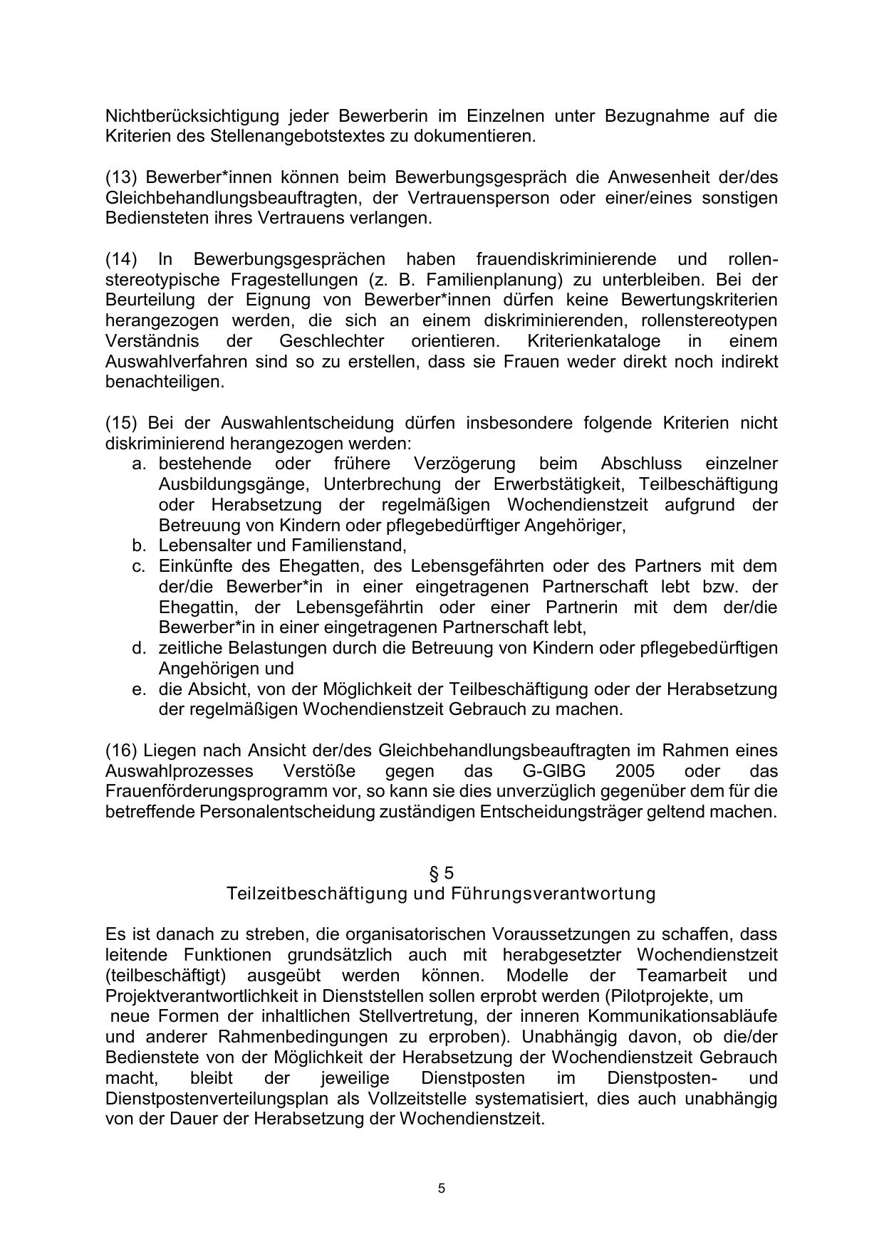 (14) In Bewerbungsgesprächen haben frauendiskriminierende und rollenstereotypische Fragestellungen (z. B. Familienplanung) zu unterbleiben. Bei der