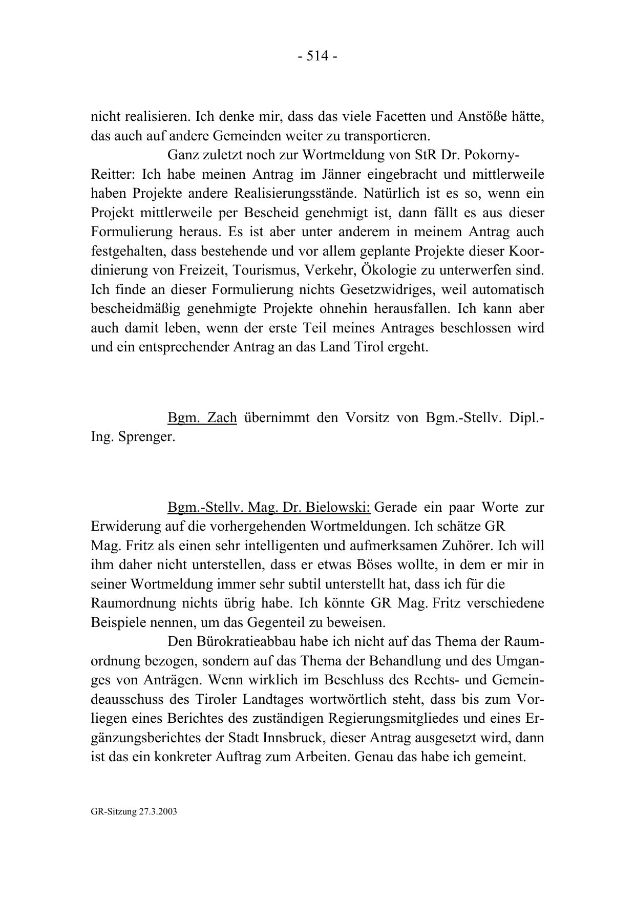 Den Bürokratieabbau habe ich nicht auf das Thema der Raumordnung bezogen, sondern auf das Thema der Behandlung und des Umganges von Anträgen. Wenn wirklich im Beschluss des Rechts- und Gemeindeausschuss des Tiroler Landtages wortwörtlich steht, dass bis zum Vorliegen eines Berichtes des zuständigen Regierungsmitgliedes und eines Ergänzungsberichtes der Stadt Innsbruck, dieser Antrag ausgesetzt wird, dann