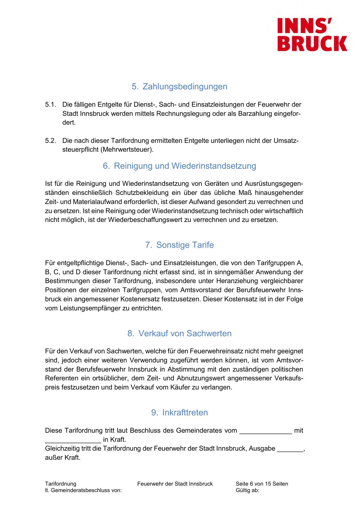 Gleichzeitig tritt die Tarifordnung der Feuerwehr der Stadt Innsbruck, Ausgabe _______,
