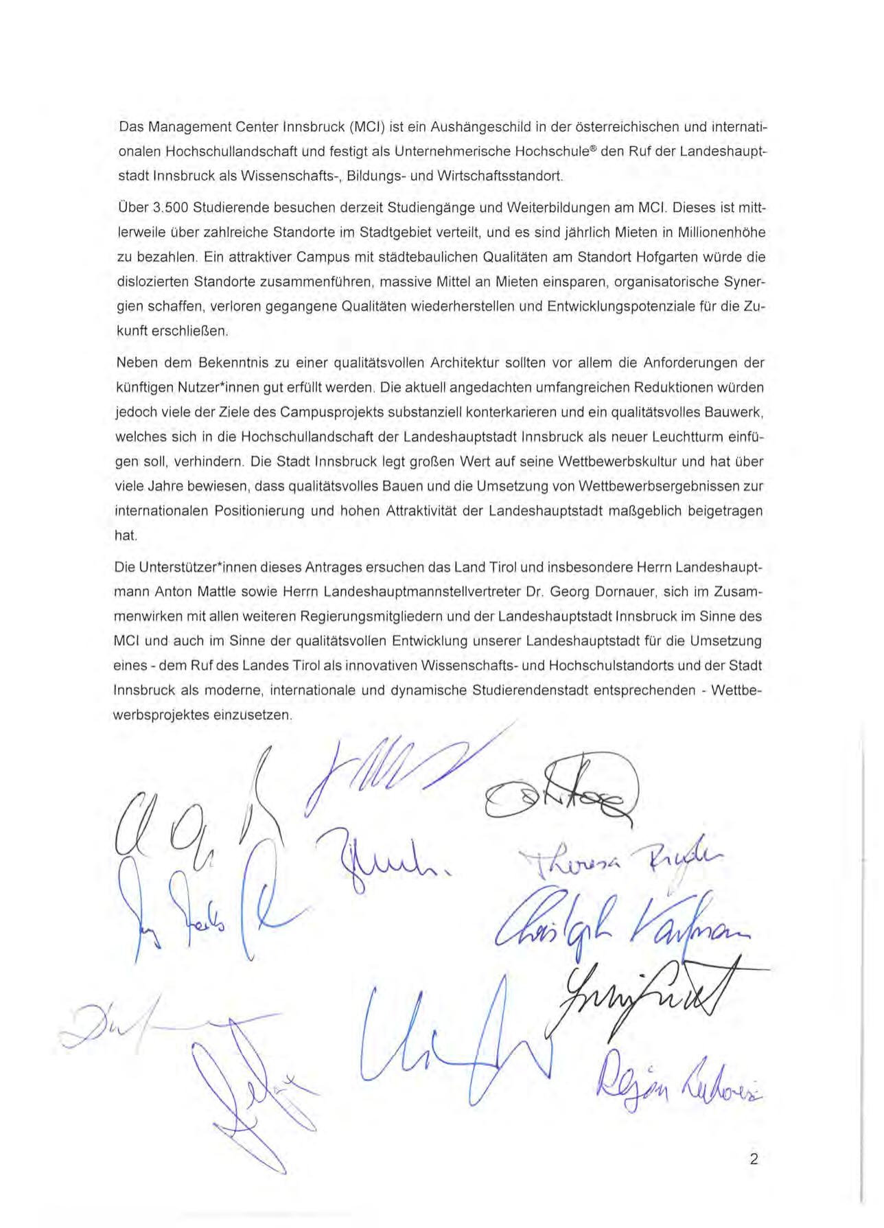 Die Unterstützer*innen dieses Antrages ersuchen das Land Tirol und insbesondere Herrn Landeshauptmann Anton Mattle sowie Herrn Landeshauptmannstellvertreter Dr. Georg Dornauer, sich im Zusammenwirken mit allen weiteren Regierungsmitgliedern und der Landeshauptstadt Innsbruck im Sinne des