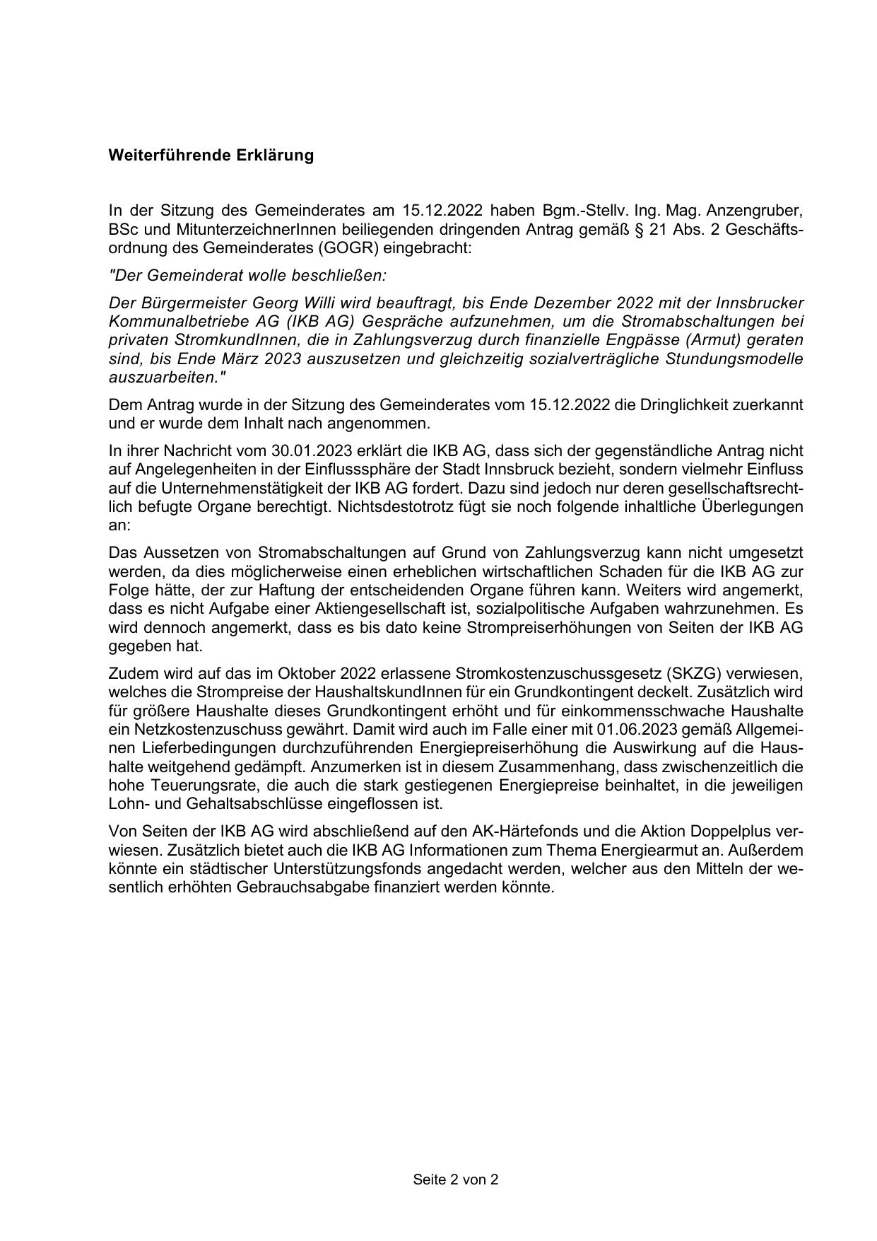 ein Netzkostenzuschuss gewährt. Damit wird auch im Falle einer mit 01.06.2023 gemäß Allgemeinen Lieferbedingungen durchzuführenden Energiepreiserhöhung die Auswirkung auf die Haushalte weitgehend gedämpft. Anzumerken ist in diesem Zusammenhang, dass zwischenzeitlich die