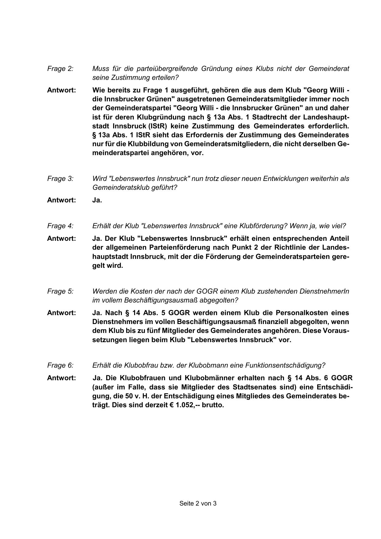 Wie bereits zu Frage 1 ausgeführt, gehören die aus dem Klub "Georg Willi die Innsbrucker Grünen" ausgetretenen Gemeinderatsmitglieder immer noch