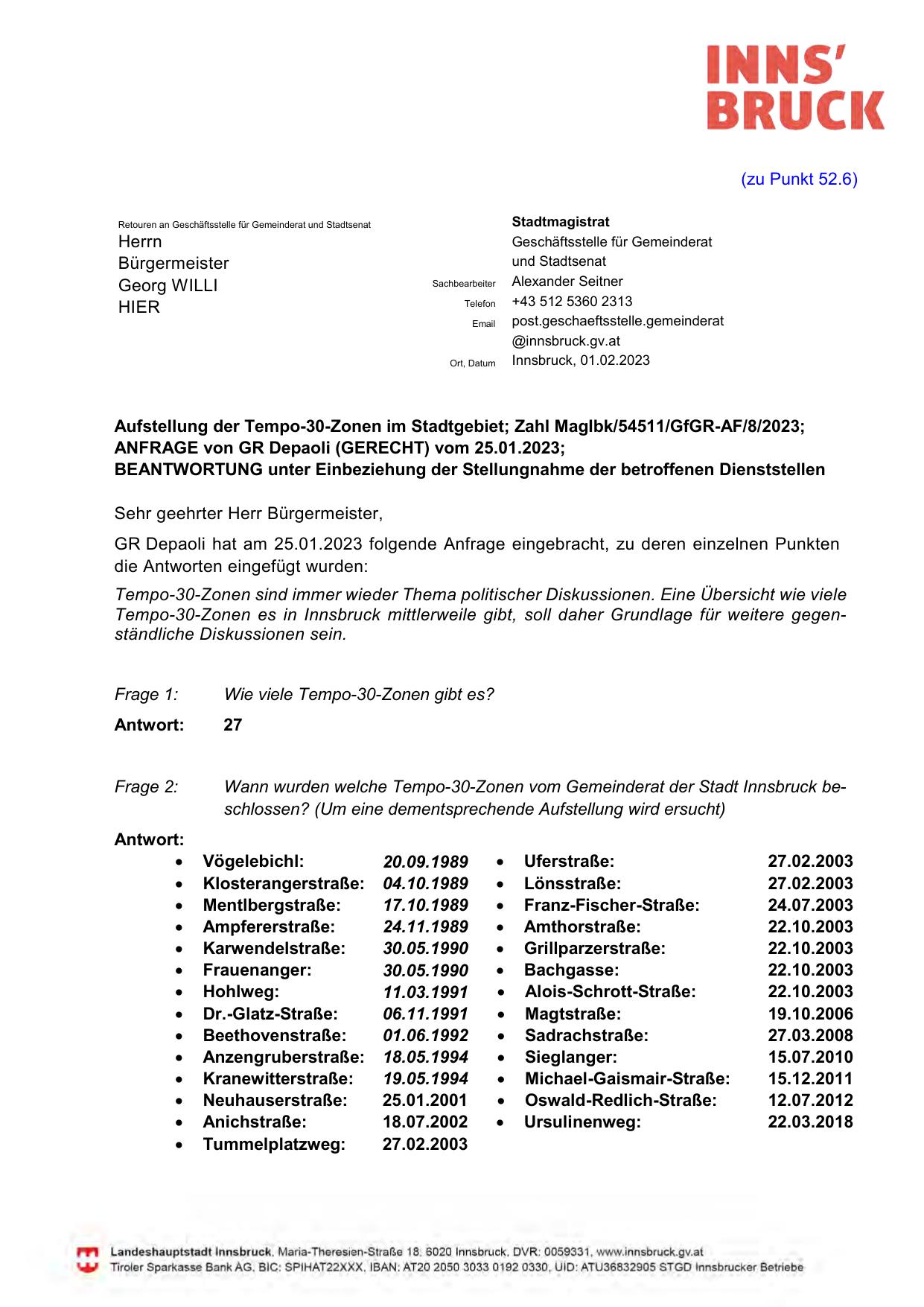 Wann wurden welche Tempo-30-Zonen vom Gemeinderat der Stadt Innsbruck beschlossen? (Um eine dementsprechende Aufstellung wird ersucht)