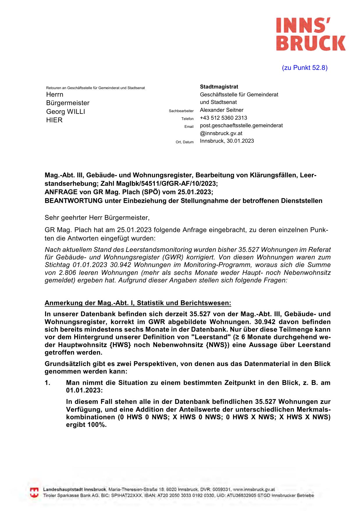 GR Mag. Plach hat am 25.01.2023 folgende Anfrage eingebracht, zu deren einzelnen Punkten die Antworten eingefügt wurden: